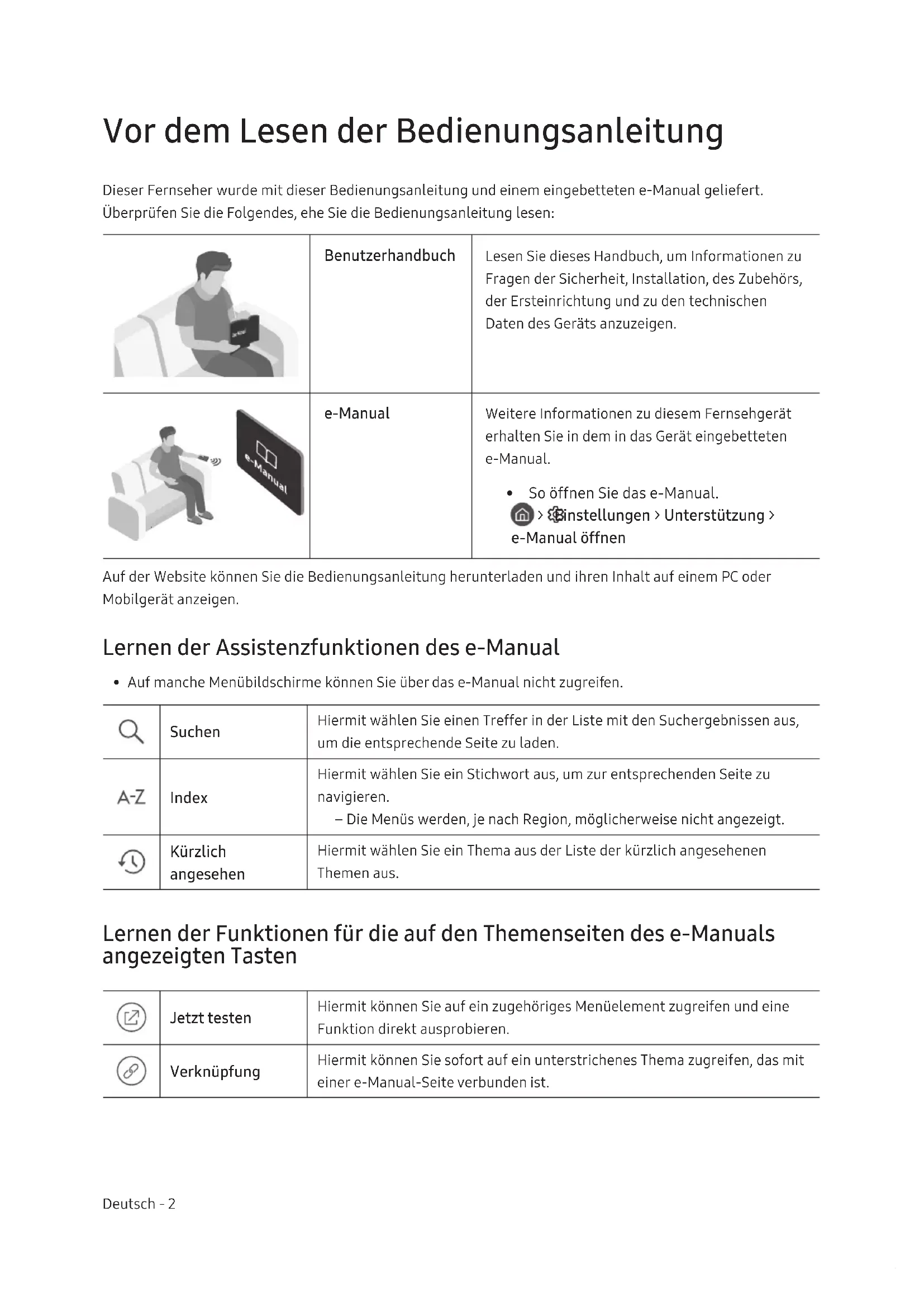 - So öffnen Sie das e-Manual. > Einstellungen > Unterstützung > e-Manual öffnen Auf der Website können Sie die Bedienungsanleitung herunterladen und ihren Inhalt auf einem PC oder Mobilgerät anzeigen. Lernen der Assistenzfunktionen des e-Manual