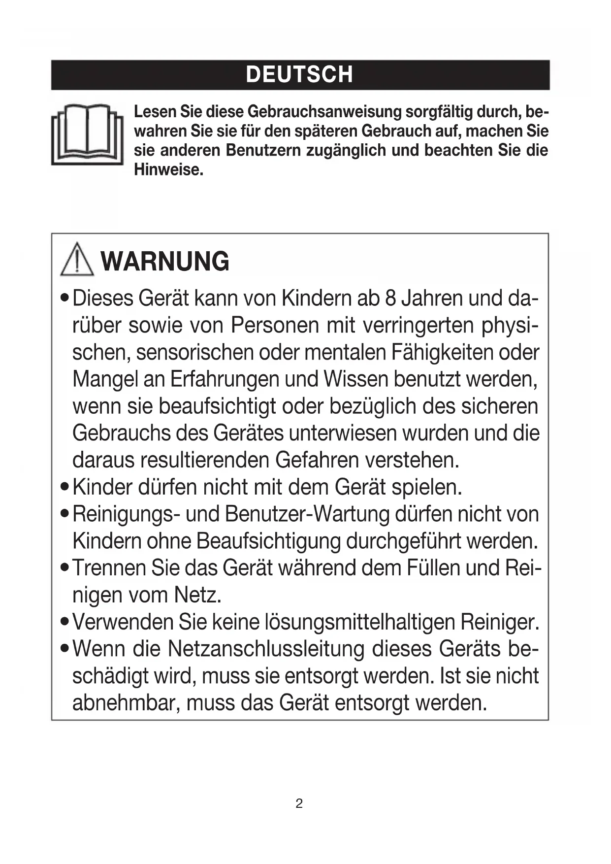 | Wartung | Reinigen Sie den Tank nach jedem Gebrauch, um R ckst nde zu vermeiden. |
