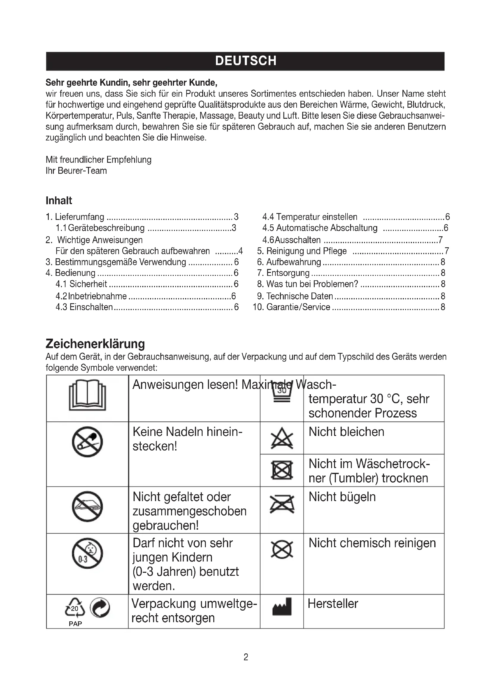 PAP Verpackung umweltge- recht entsorgen Hersteller Inhalt Sehr geehrte Kundin, sehr geehrter Kunde, wir freuen uns, dass Sie sich für ein Produkt unseres Sortimentes entschieden haben. Unser Name steht für hochwertige und eingehend geprüfte Qualitätsprodukte aus den Bereichen Wärme, Gewicht, Blutdruck, Körpertemperatur, Puls, Sanfte Therapie, Massage, Beauty und Luft. Bitte lesen Sie diese Gebrauchsanwei- sung aufmerksam durch, bewahren Sie sie für späteren Gebrauch auf, machen Sie sie anderen Benutzern zugänglich und beachten Sie die Hinweise. Mit freundlicher Empfehlung Ihr Beurer-Team3 Dieses Produkt erfüllt die Anforderungen der geltenden europäischen und nationalen Richtli- nien. Die Produkte entspre- chen nachweislich den Anforderungen der tech- nischen Regelwerke der EAWU Das Gerät ist doppelt schutzisoliert und ent