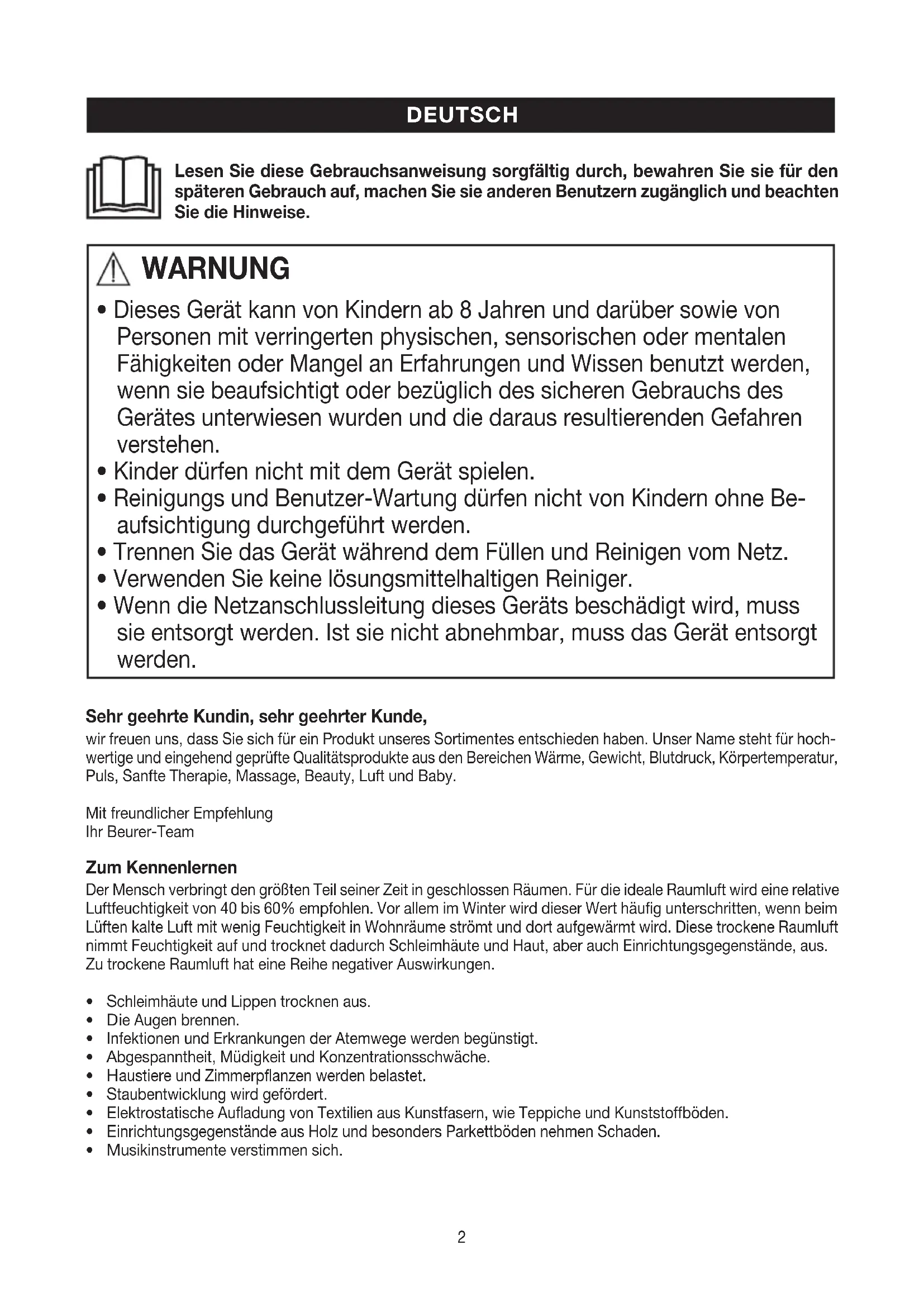 - Wenn die Netzanschlussleitung dieses Geräts beschädigt wird, muss sie entsorgt werden. Ist sie nicht abnehmbar, muss das Gerät entsorgt werden. Sehr geehrte Kundin, sehr geehrter Kunde, wir freuen uns, dass Sie sich für ein Produkt unseres Sortimentes entschieden haben. Unser Name steht für hoch- wertige und eingehend geprüfte Qualitätsprodukte aus den Bereichen Wärme, Gewicht, Blutdruck, Körpertemperatur, Puls, Sanfte Therapie, Massage, Beauty, Luft und Baby. Mit freundlicher Empfehlung Ihr Beurer-Team Zum Kennenlernen Der Mensch verbringt den größten Teil seiner Zeit in geschlossen Räumen. Für die ideale Raumluft wird eine relative Luftfeuchtigkeit von 40 bis 60% empfohlen. Vor allem im Winter wird dieser Wert häufig unterschritten, wenn beim Lüften kalte Luft mit wenig Feuchtigkeit in Wohnräume strömt und dort aufgewärmt wird. Diese trockene Raumluft nimmt Feuchtigkeit auf und trocknet dadurch Schleimhäute und Haut, aber auch Einrichtungsgegenstände, aus. Zu trockene Raumluft hat eine Reihe negativer Auswirkungen.