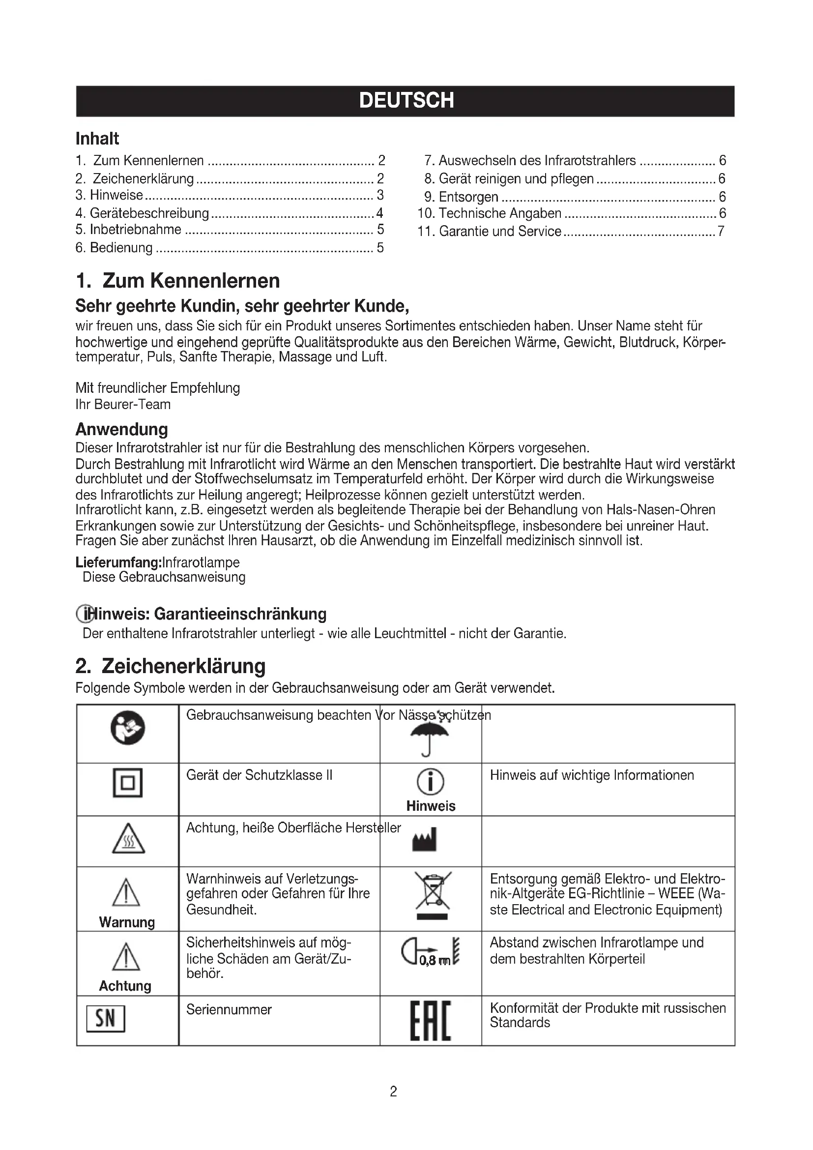 temperatur, Puls, Sanfte Therapie, Massage und Luft. Mit freundlicher Empfehlung Ihr Beurer-Team Anwendung Dieser Infrarotstrahler ist nur für die Bestrahlung des menschlichen Körpers vorgesehen. Durch Bestrahlung mit Infrarotlicht wird Wärme an den Menschen transportiert. Die bestrahlte Haut wird verstärkt durchblutet und der Stoffwechselumsatz im Temperaturfeld erhöht. Der Körper wird durch die Wirkungsweise des Infrarotlichts zur Heilung angeregt; Heilprozesse können gezielt unterstützt werden. Infrarotlicht kann, z.B. eingesetzt werden als begleitende Therapie bei der Behandlung von Hals-Nasen-Ohren Erkrankungen sowie zur Unterstützung der Gesichts- und Schönheitspflege, insbesondere bei unreiner Haut. Fragen Sie aber zunächst Ihren Hausarzt, ob die Anwendung im Einzelfall medizinisch sinnvoll ist. Lieferumfang: Infrarotlampe Diese Gebrauchsanweisung Hinweis: Garantieeinschränkung Der enthaltene Infrarotstrahler unterliegt - wie alle Leuchtmittel - nicht der Garantie.