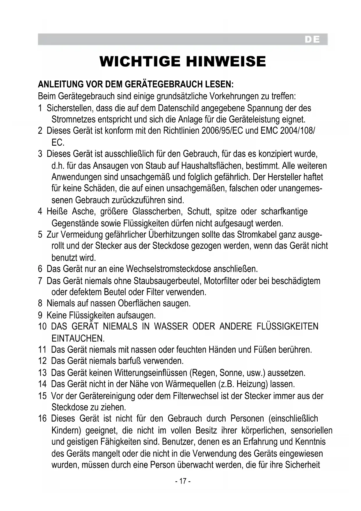 WICHTIGE HINWEISE ANLEITUNG VOR DEM GERÄTEGEBRAUCH LESEN: Beim Gerätegebrauch sind einige grundsätzliche Vorkehrungen zu treffen: 1 Sicherstellen, dass die auf dem Datenschild angegebene Spannung der des Stromnetzes entspricht und sich die Anlage für die Geräteleistung eignet. 2 Dieses Gerät ist konform mit den Richtlinien 2006/95/EC und EMC 2004/108/ EC. 3 Dieses Gerät ist ausschließlich für den Gebrauch, für das es konzipiert wurde, d.h. für das Ansaugen von Staub auf Haushaltsflächen, bestimmt. Alle weiteren Anwendungen sind unsachgemäß und folglich gefährlich. Der Hersteller haftet für keine Schäden, die auf einen unsachgemäßen, falschen oder unangemes- senen Gebrauch zurückzuführen sind. 4 Heiße Asche, größere Glasscherben, Schutt, spitze oder scharfkantige Gegenstände sowie Flüssigkeiten dürfen nicht aufgesaugt werden. 5 Zur Vermeidung gefährlicher Überhitzungen sollte das Stromkabel ganz ausge- rollt und der Stecker aus der Steckdose gezogen werden, wenn das Gerät nicht benutzt wird. 6 Das Gerät nur an eine Wechselstromsteckdose anschließen. 7 Das Gerät niemals ohne Staubsaugerbeutel, Motorfilter oder bei beschädigtem oder defektem Beutel oder Filter verwenden. 8 Niemals auf nassen Oberflächen saugen. 9 Keine Flüssigkeiten aufsaugen. 10 DAS GERÄT NIEMALS IN WASSER ODER ANDERE FLÜSSIGKEITEN EINTAUCHEN. 11 Das Gerät niemals mit nassen oder feuchten Händen und Füßen berühren. 12 Das Gerät niemals barfuß verwenden. 13 Das Gerät keinen Witterungseinflüssen (Regen, Sonne, usw.) aussetzen. 14 Das Gerät nicht in der Nähe von Wärmequellen (z.B. Heizung) lassen. 15 Vor der Gerätereinigung oder dem Filterwechsel ist der Stecker immer aus der Steckdose zu ziehen. 16 Dieses Gerät ist nicht für den Gebrauch durch Personen (einschließlich Kindern) geeignet, die nicht im vollen Besitz ihrer körperlichen, sensoriellen und geistigen Fähigkeiten sind. Benutzer, denen es an Erfahrung und Kenntnis des Geräts mangelt oder die nicht in die Verwendung des Geräts eingewiesen wurden, müssen durch eine Person überwacht werden, die für ihre SicherheitDE