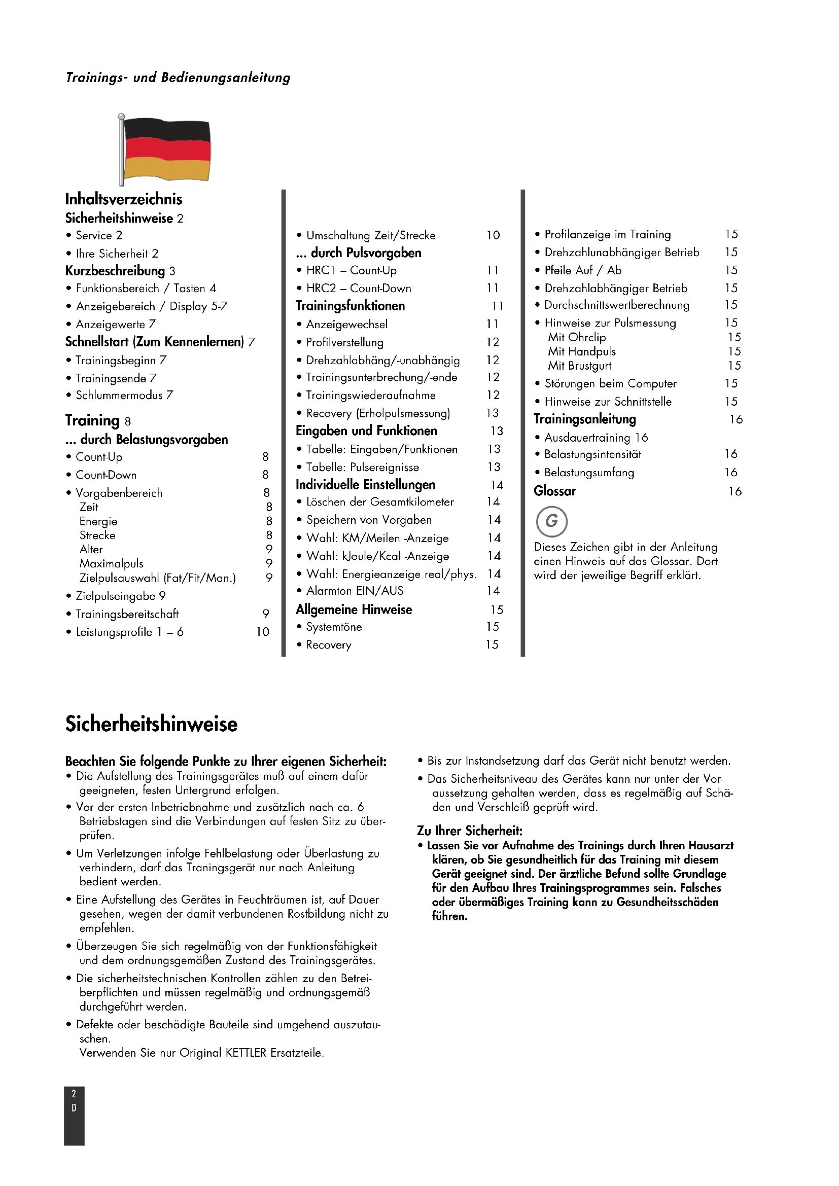 - Lassen Sie vor Aufnahme des Trainings durch Ihren Hausarztklären, ob Sie gesundheitlich für das Training mit diesemGerät geeignet sind. Der ärztliche Befund sollte Grundlagefür den Aufbau Ihres Trainingsprogrammes sein. Falschesoder übermäßiges Training kann zu Gesundheitsschädenführen. Inhaltsverzeichnis Sicherheitshinweise 2