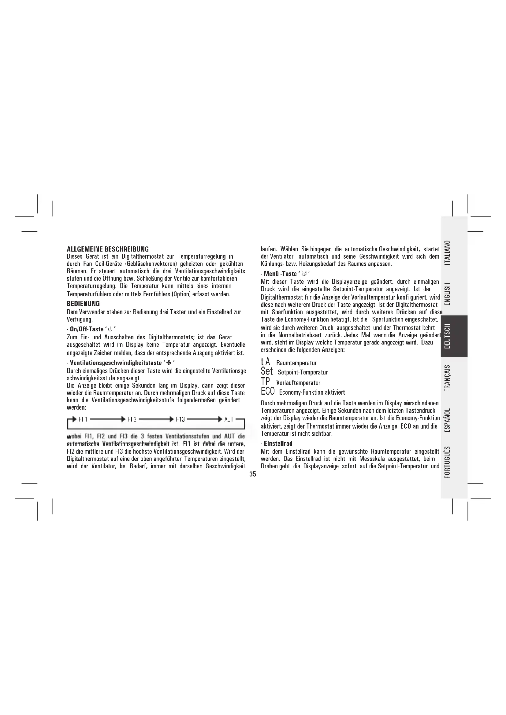 Dieses Gerät ist ein Digitalthermostat zur Temperaturregelung in durch Fan Coil-Geräte (Gebläsekonvektoren) geheizten oder gekühlten Räumen. Er steuert automatisch die drei Ventilationsgeschwindigkeits stufen und die Öffnung bzw. Schließung der Ventile zur komfortableren Temperaturregelung. Die Temperatur kann mittels eines internen Temperaturfühlers oder mittels Fernfühlers (Option) erfasst werden.