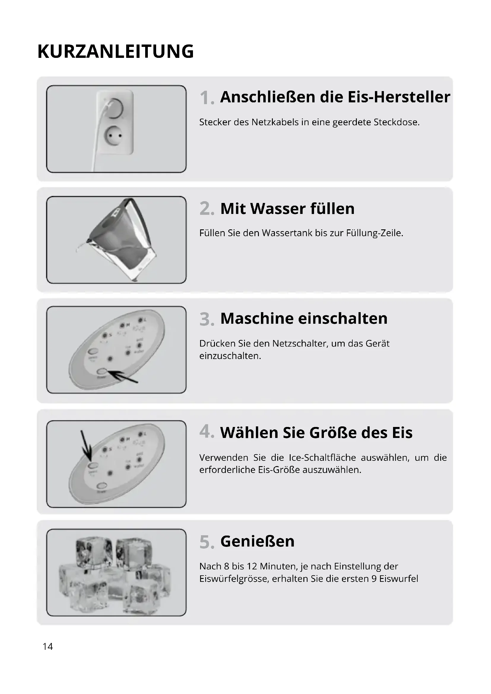 GARANTIEWählen Sie Größe des Eis Verwenden Sie die Ice-Schaltäche auswählen, um die erforderliche Eis-Größe auszuwählen. KURZANLEITUNG
