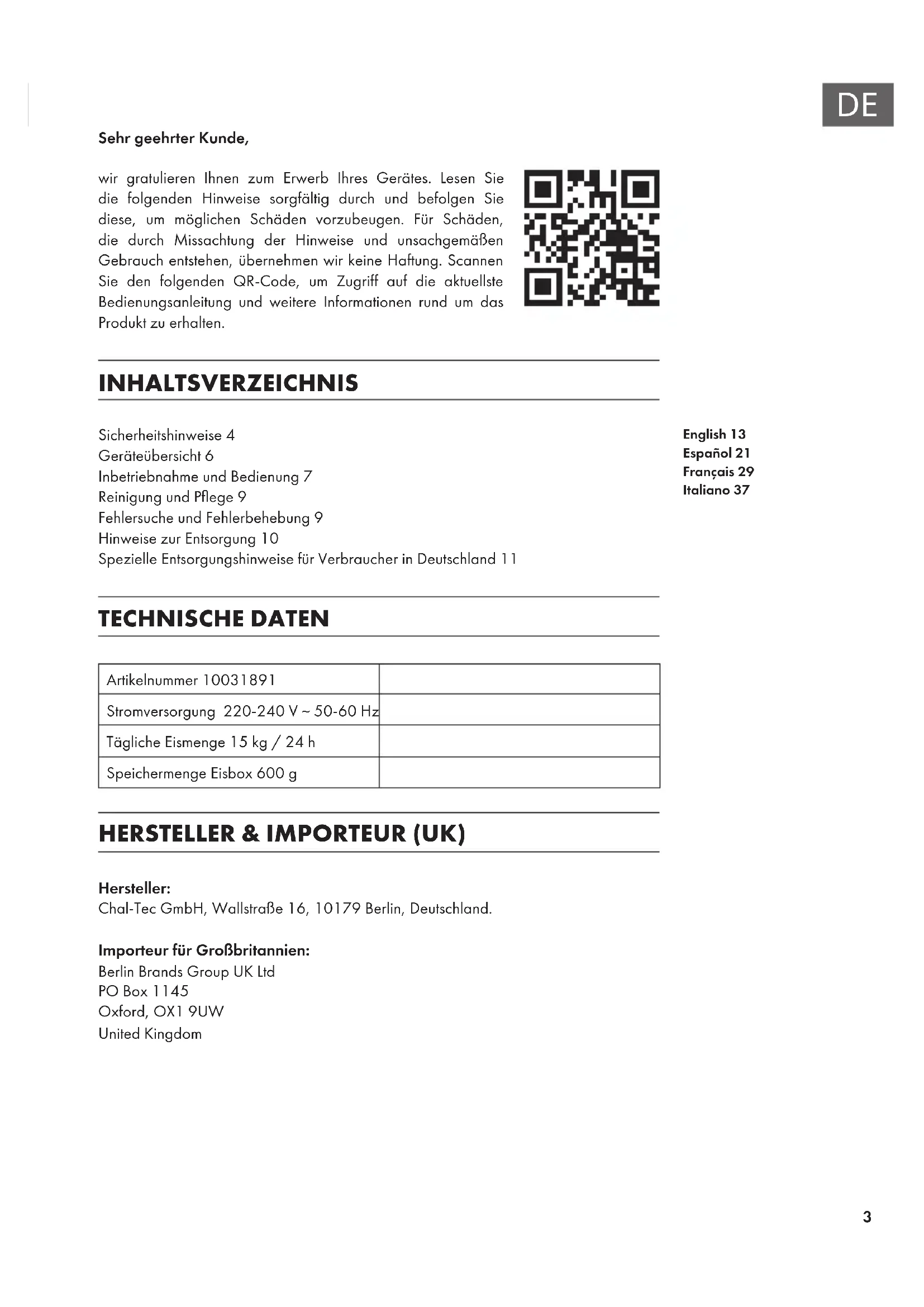 | Technische Merkmale | Eiswürfelproduktionskapazit t: 12 kg/24h |