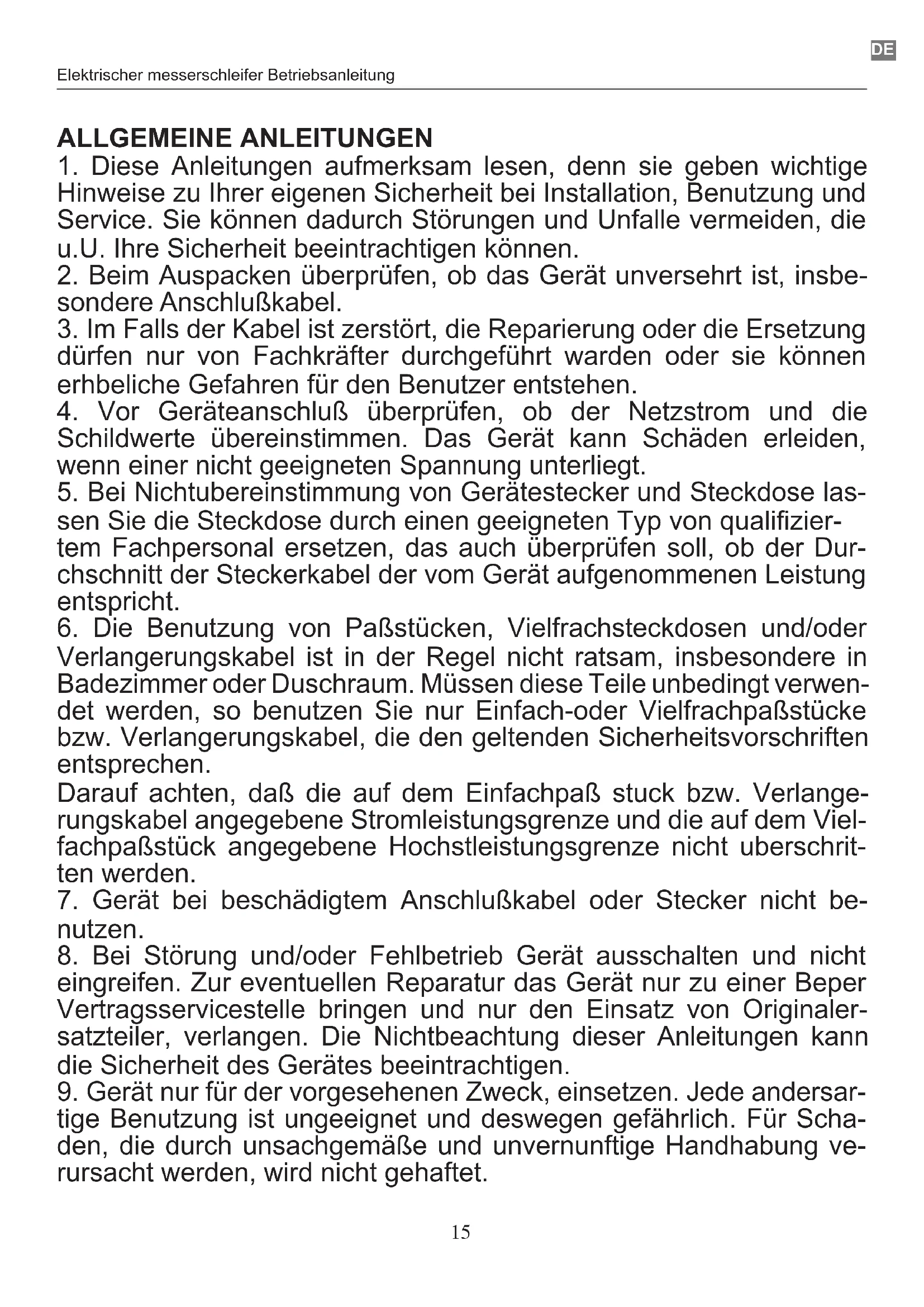 ELEKTRISCHER MESSERSCHLEIFER BETRIEBSANLEITUNG