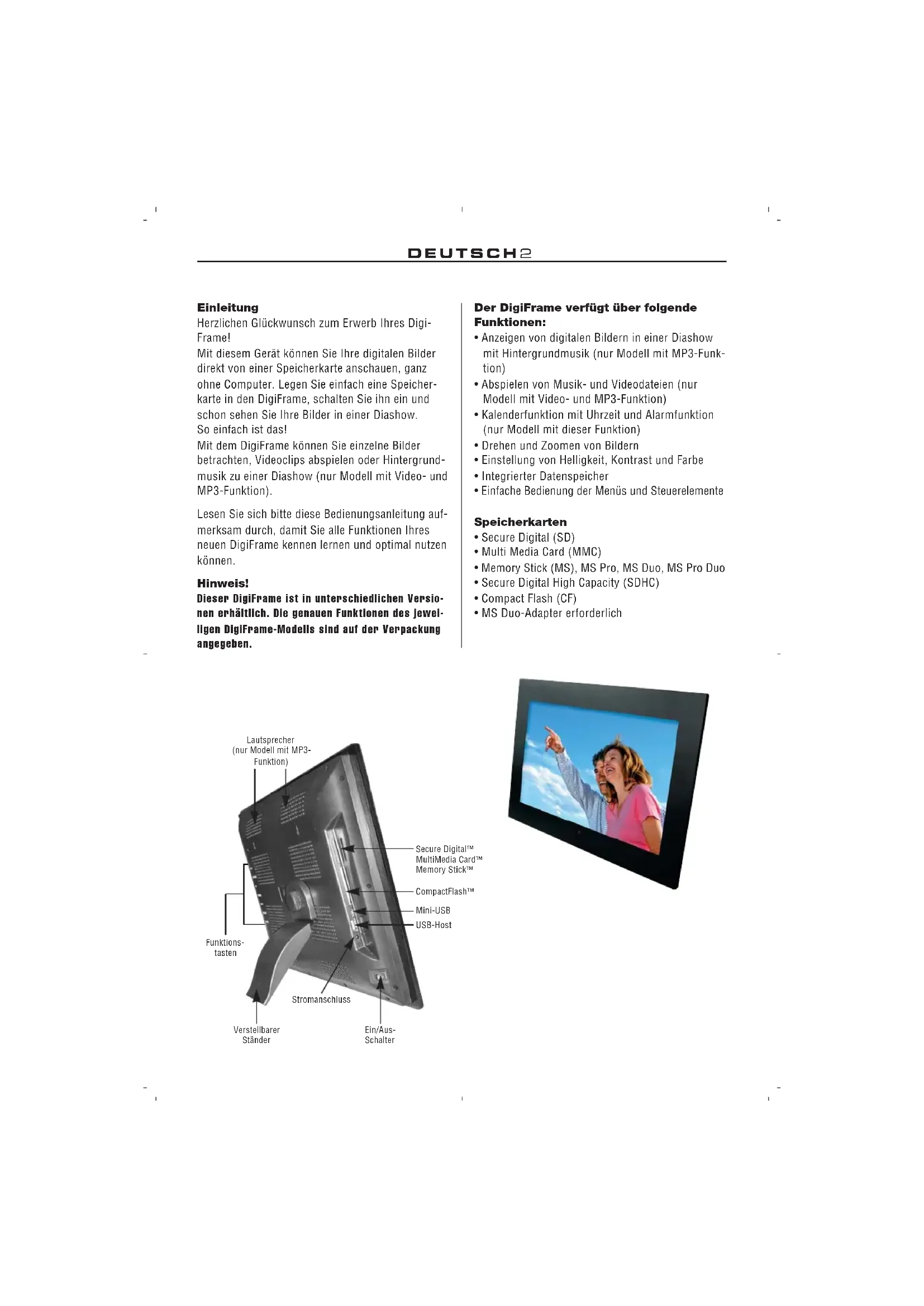 - ___ Hinweis! Dieser DigiFrame ist in unterschiedlichen Ver- sionen erhältlich. Die genauen Funktionen des jeweiligen DigiFrame-Modells sind auf der Ver- packung angegeben. Important! Please note that this Digital Picture Frame comes in different versions. The detailed features of each Digital Picture Frame are specified on the package. Remarque ! DigiFrame existe en différentes versions. Les fon- ctions exactes de chaque modèle DigiFrame sont mentionnées sur l’emballage. ¡Observación! Este DigiFrame puede conseguirse en diferentes versiones. Las funciones precisas del modelo respectivo de DigiFrame se encuentran en la envoltura. Nota! La DigiFrame è disponibile in diverse versioni. Le funzioni specifiche relative ad ogni diverso mo- dello di DigiFrame sono indicate sulla confezione. Aanwijzing! Deze DigiFrame is in verschillende versies ver- krijgbaar. De precieze functies van het betreffen- de DigiFrame-model staan op de verpakking ver- meld. Importante! Por favor note que este Moldura de Fotografia Digital vem em diferentes versões. A descrição pormenorizada das características do modelo são especificados na embalagem. Viktigt! Observera att detta Digital Foto Ram finns i olika versioner. De närmare omständigheterna i varje enskilt Digital Foto Ram anges på förpackningen.DEUTSCH2 Einleitung Herzlichen Glückwunsch zum Erwerb Ihres Digi- Frame! Mit diesem Gerät können Sie Ihre digitalen Bilder direkt von einer Speicherkarte anschauen, ganz ohne Computer. Legen Sie einfach eine Speicher- karte in den DigiFrame, schalten Sie ihn ein und schon sehen Sie Ihre Bilder in einer Diashow. So einfach ist das! Mit dem DigiFrame können Sie einzelne Bilder betrachten, Videoclips abspielen oder Hintergrund- musik zu einer Diashow (nur Modell mit Video- und MP3-Funktion). Lesen Sie sich bitte diese Bedienungsanleitung auf- merksam durch, damit Sie alle Funktionen Ihres neuen DigiFrame kennen lernen und optimal nutzen können. Hinweis! Dieser DigiFrame ist in unterschiedlichen Versio- nen erhältlich. Die genauen Funktionen des jewei- ligen DigiFrame-Modells sind auf der Verpackung angegeben. Der DigiFrame verfügt über folgende Funktionen: p. 65