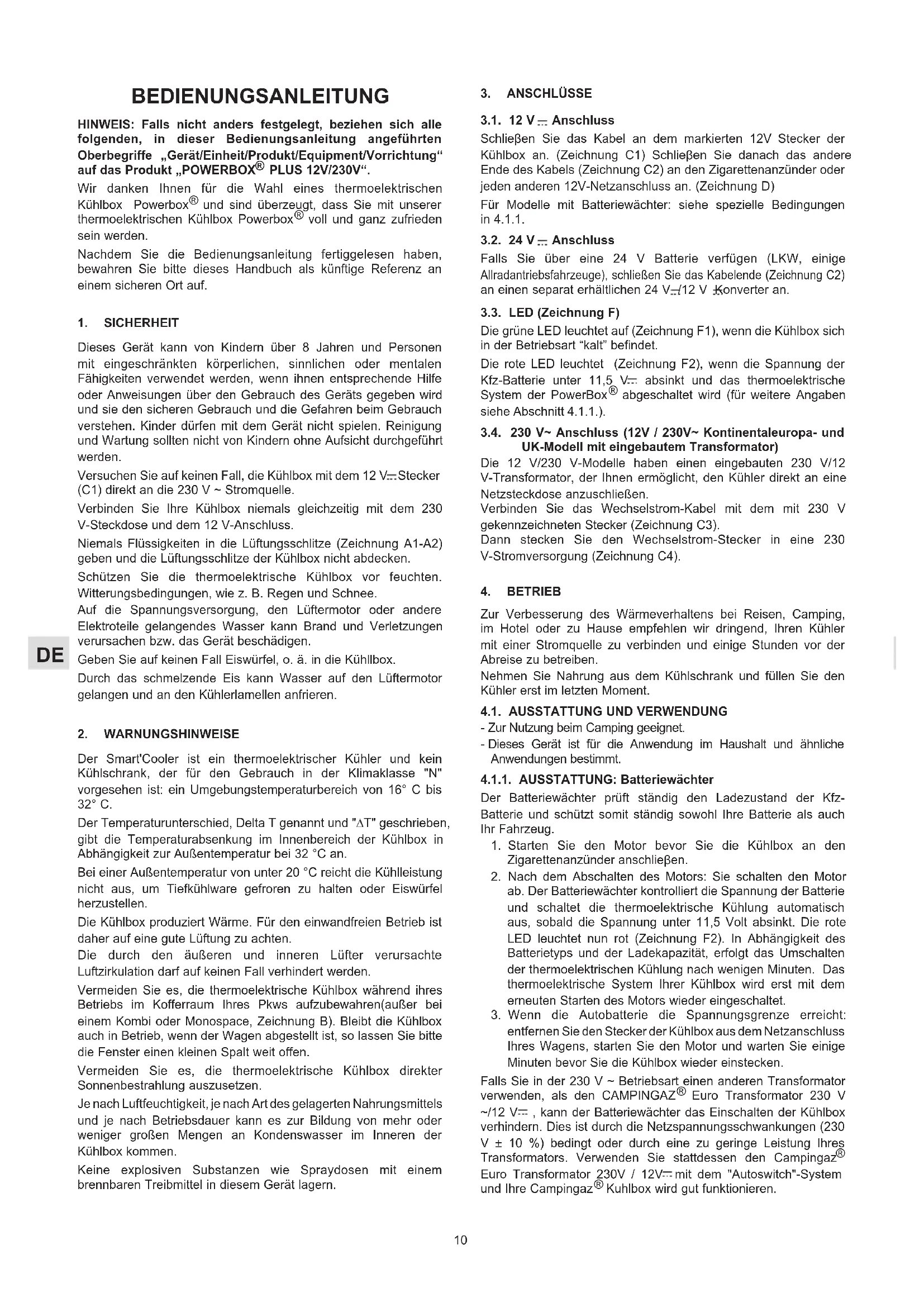 3.1. 12 V Anschluss Schlieβen Sie das Kabel an dem markierten 12V Stecker der Kühlbox an. (Zeichnung C1) Schlieβen Sie danach das andere Ende des Kabels (Zeichnung C2) an den Zigarettenanzünder oder jeden anderen 12V-Netzanschluss an. (Zeichnung D) Für Modelle mit Batteriewächter: siehe spezielle Bedingungen in 4.1.1. 3.2. 24 V Anschluss Falls Sie über eine 24 V Batterie verfügen (LKW, einige Allradantriebsfahrzeuge), schließen Sie das Kabelende (Zeichnung C2) an einen separat erhältlichen 24 V /12 V Konverter an. 3.3. LED (Zeichnung F) Die grüne LED leuchtet auf (Zeichnung F1), wenn die Kühlbox sich in der Betriebsart “kalt” befindet. Die rote LED leuchtet (Zeichnung F2), wenn die Spannung der Kfz-Batterie unter 11,5 V absinkt und das thermoelektrische System der PowerBox