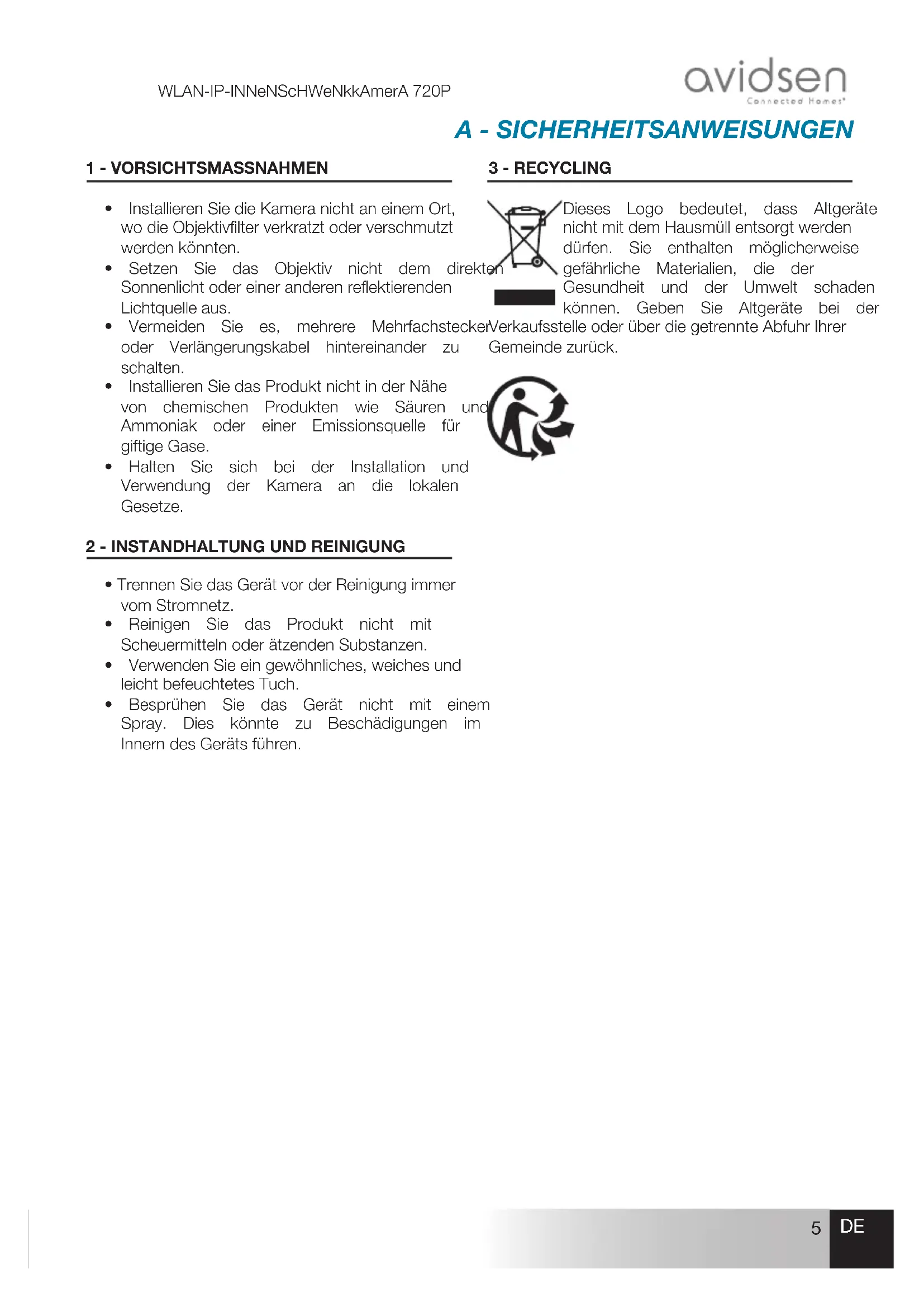 KonformitätmitderR&TTE-Richtlinie AVIDSENerklärt,dassdasnachfolgendeGerät: WLAN-IP-Innenkamera720P123382 derRED-RichtlinieentsprichtunddieKonformitätin AnwendungdergeltendenNormenbewertetwurde: EN60065:2014 EN62479:2010 EN301489-1V2.1.0:2016-04 EN301489-17V3.1.0:2016-04 EN300328V2.0.20:2016-03 ChambraylesTours,06.02.2017 AlexandreChaverot,PräsidentAvidsenFranceS.A.S-32,rueAugustinFresnel 37170ChambraylesTours-Frankreichwww.avidsen.comV1 Visi