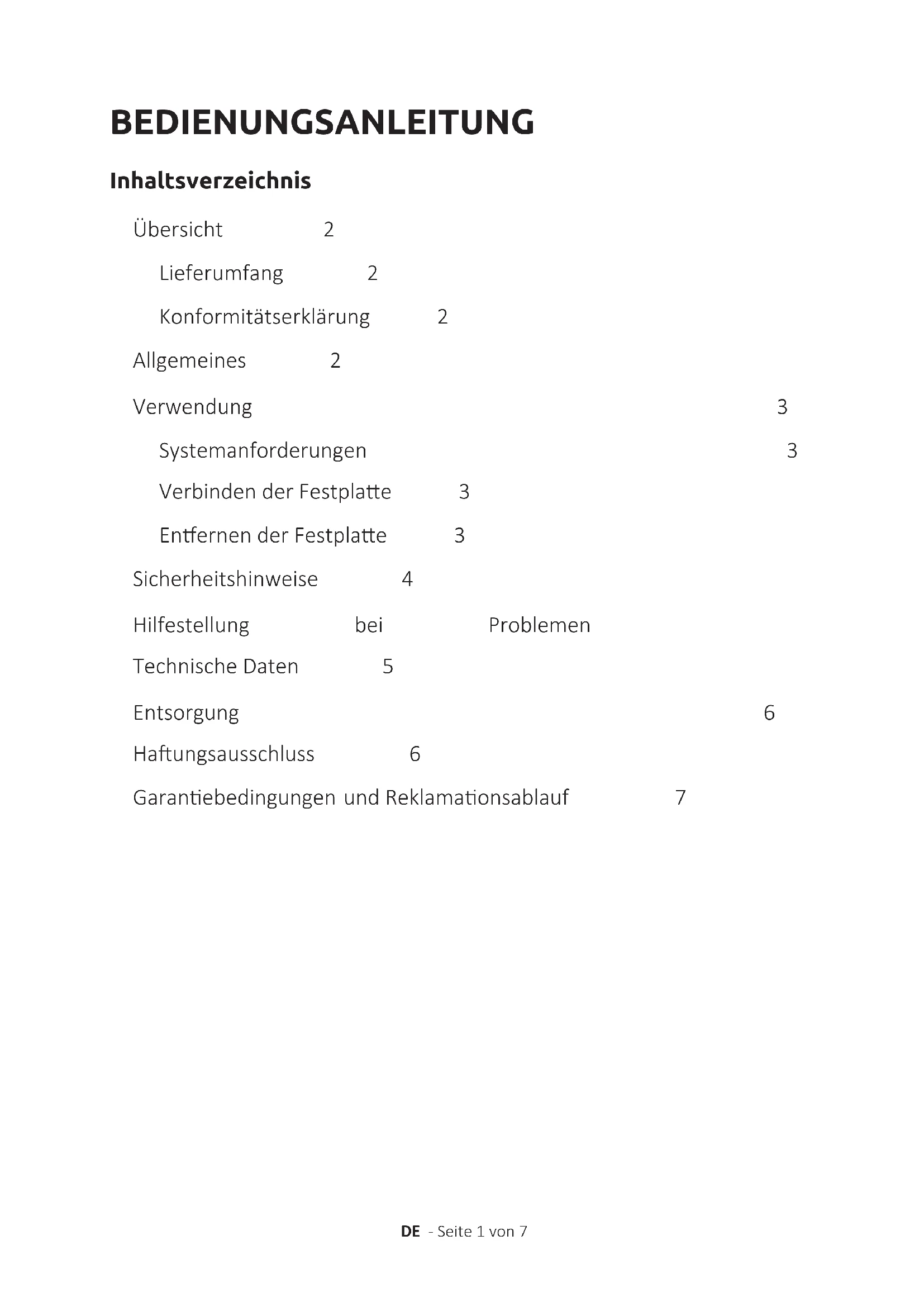 RU инструкцияпоэксплуатации Стр. 1- 7BEDIENUNGSANLEITUNG DE -Seite1von7 Inhaltsverzeichnis Übersicht 2 Lieferumfang 2 Konformitätserklärung 2 Allgemeines 2 Verwendung 3 Systemanforderungen 3 VerbindenderFestplae 3 EnernenderFestplae 3 Sicherheitshinweise 4 Hilfestellung bei Problemen 5 TechnischeDaten 5 Entsorgung 6 Haungsausschluss 6 GaranebedingungenundReklamaonsablauf 7DE-Seite2von7 LesenSiedieseAnleitungsorgfälgdurchundbeachtenundbefolgenSiebiesämtlichein dieserAnleitungerwähntenHinweise,umeinelangeLebensdauerundeinezuverlässige NutzungdesGeräteszugewährleisten.HebenSiedieseAnleitunggriereitaufundgeben SiesieanandereNutzerdesGerätesweiter. Zu dieser Anleitung ALLGEMEINES Konformitätserklärung DieCE-Kennzeichnungbesagt,dassdiesesProduktdieAnforderungenallerfür diesesProduktgülgenEU-Richtlinienerfüllt. Lieferumfang ÜBERSICHT DerHauptzweckdieserexternenFestplaebestehtinderSpeicherungvonDatenvonTV Geräten,PCs,Notebooks,UltrabooksoderMACComputern.DiesesProduktistnichtfüreine kommerzielleNutzungoderfürmedizinischeundspezielleAnwendungenvorgesehen,indenen derAusfalldesProduktesVerletzungen,TodesfälleodererheblicheSachschädenverursachen kann.ImFalleeinerNutzung,dienichtdembesmmungsgemäßenGebrauchentspricht,erlischt dieHaung.DasÖnensowieUmbauendesGerätesunddieNutzungvonZusatzgerätenund Zubehörteilen,dienichtvonunsgenehmigtwurden,sindzuunterlassen.NutzenSiedasGerät nichtunterextremenUmgebungsbedingungenundbeachtenSiedieSicherheitshinweise.Ein NichtbeachtenderInformaonenundSicherheitshinweiseindieserAnleitunggiltalsNichtbe- achtendesbesmmungsmäßigenGebrauchsundführtzumErlöschenderHaungundkannzu Personen-oderSachschadenführen. Bestimmungsgemäßer Gebrauch