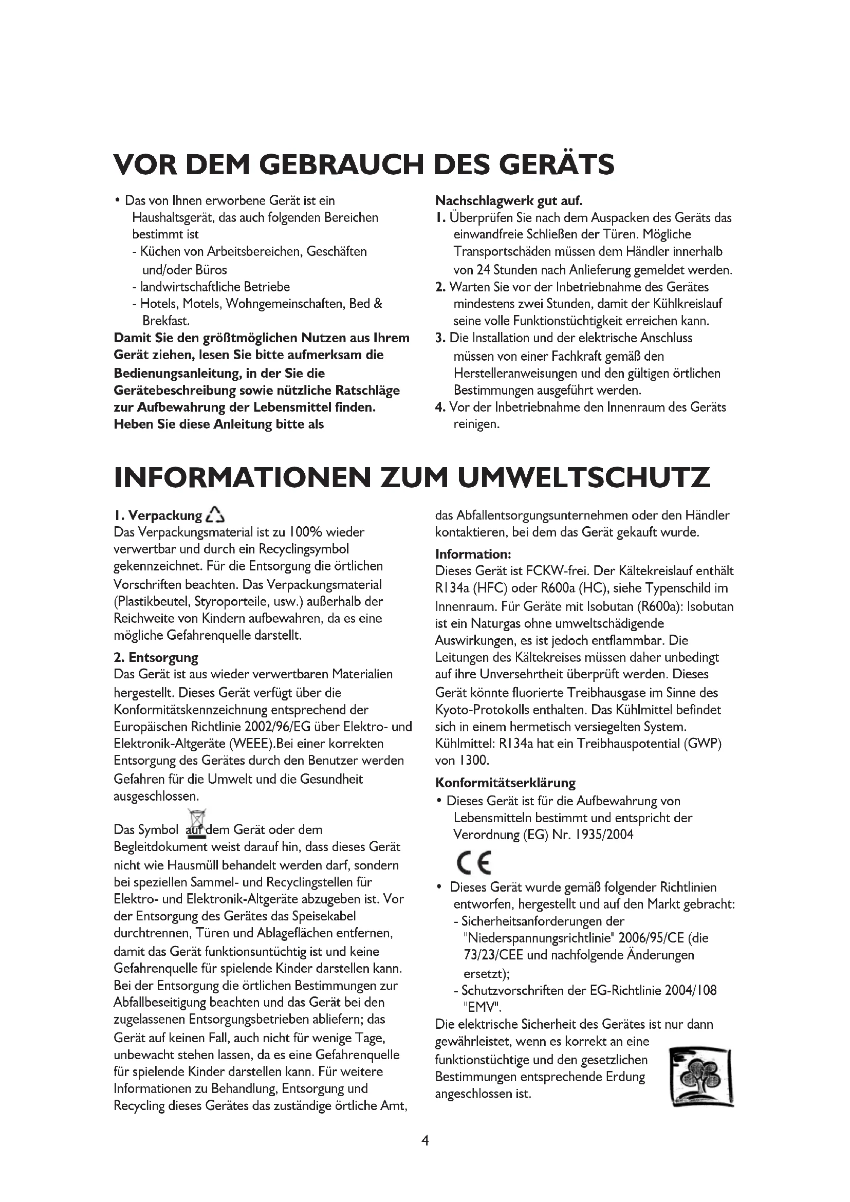 Das Gerät ist aus wieder verwertbaren Materialien hergestellt. Dieses Gerät verfügt über die Konformitätskennzeichnung entsprechend der Europäischen Richtlinie 2002/96/EG über Elektro- und Elektronik-Altgeräte (WEEE).Bei einer korrekten Entsorgung des Gerätes durch den Benutzer werden Gefahren für die Umwelt und die Gesundheit ausgeschlossen. Das Symbol auf dem Gerät oder dem Begleitdokument weist darauf hin, dass dieses Gerät nicht wie Hausmüll behandelt werden darf, sondern bei speziellen Sammel- und Recyclingstellen für Elektro- und Elektronik-Altgeräte abzugeben ist. Vor der Entsorgung des Gerätes das Speisekabel durchtrennen, Türen und Ablageflächen entfernen, damit das Gerät funktionsuntüchtig ist und keine Gefahrenquelle für spielende Kinder darstellen kann. Bei der Entsorgung die örtlichen Bestimmungen zur Abfallbeseitigung beachten und das Gerät bei den zugelassenen Entsorgungsbetrieben abliefern; das Gerät auf keinen Fall, auch nicht für wenige Tage, unbewacht stehen lassen, da es eine Gefahrenquelle für spielende Kinder darstellen kann. Für weitere Informationen zu Behandlung, Entsorgung und Recycling dieses Gerätes das zuständige örtliche Amt, das Abfallentsorgungsunternehmen oder den Händler kontaktieren, bei dem das Gerät gekauft wurde. Information: Dieses Gerät ist FCKW-frei. Der Kältekreislauf enthält R134a (HFC) oder R600a (HC), siehe Typenschild im Innenraum. Für Geräte mit Isobutan (R600a): Isobutan ist ein Naturgas ohne umweltschädigende Auswirkungen, es ist jedoch entflammbar. Die Leitungen des Kältekreises müssen daher unbedingt auf ihre Unversehrtheit überprüft werden. Dieses Gerät könnte fluorierte Treibhausgase im Sinne des Kyoto-Protokolls enthalten. Das Kühlmittel befindet sich in einem hermetisch versiegelten System. Kühlmittel: R134a hat ein Treibhauspotential (GWP) von 1300. Konformitätserklärung