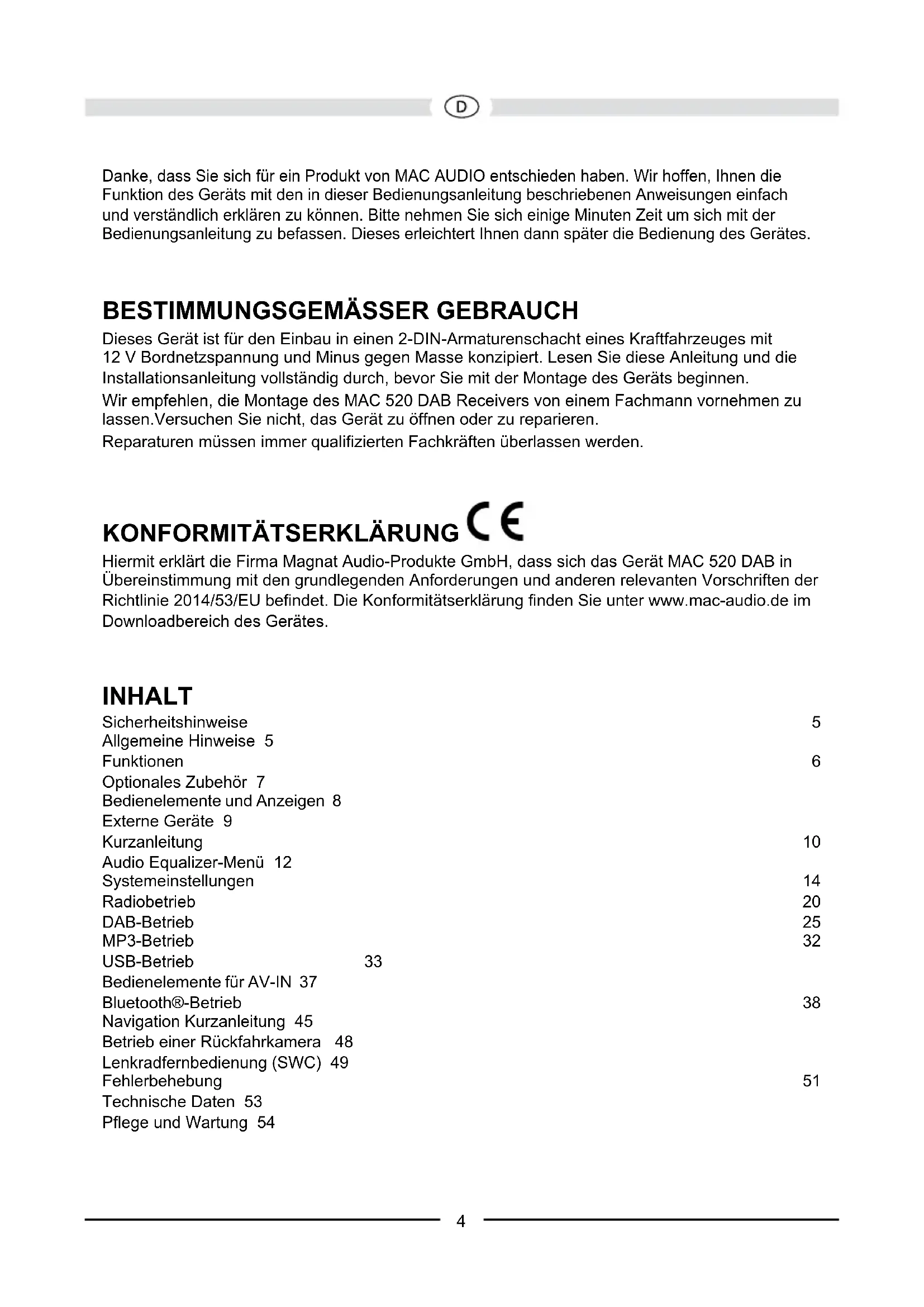 Hiermit erklärt die Firma Magnat Audio-Produkte GmbH, dass sich das Gerät MAC 520 DAB in Übereinstimmung mit den grundlegenden Anforderungen und anderen relevanten Vorschriften der Richtlinie 2014/53/EU bendet. Die Konformitätserklärung nden Sie unter www.mac-audio.de im Downloadbereich des Gerätes. INHALT Sicherheitshinweise 5 Allgemeine Hinweise 5 Funktionen 6 Optionales Zubehör 7 Bedienelemente und Anzeigen 8 Externe Geräte 9 Kurzanleitung 10 Audio Equalizer-Menü 12 Systemeinstellungen 14 Radiobetrieb 20 DAB-Betrieb 25 MP3-Betrieb 32 USB-Betrieb 33 Bedienelemente für AV-IN 37 Bluetooth®-Betrieb 38 Navigation Kurzanleitung 45 Betrieb einer Rückfahrkamera 48 Lenkradfernbedienung (SWC) 49 Fehlerbehebung 51 Technische Daten 53 Pege und Wartung 54 4SICHERHEITSHINWEISE