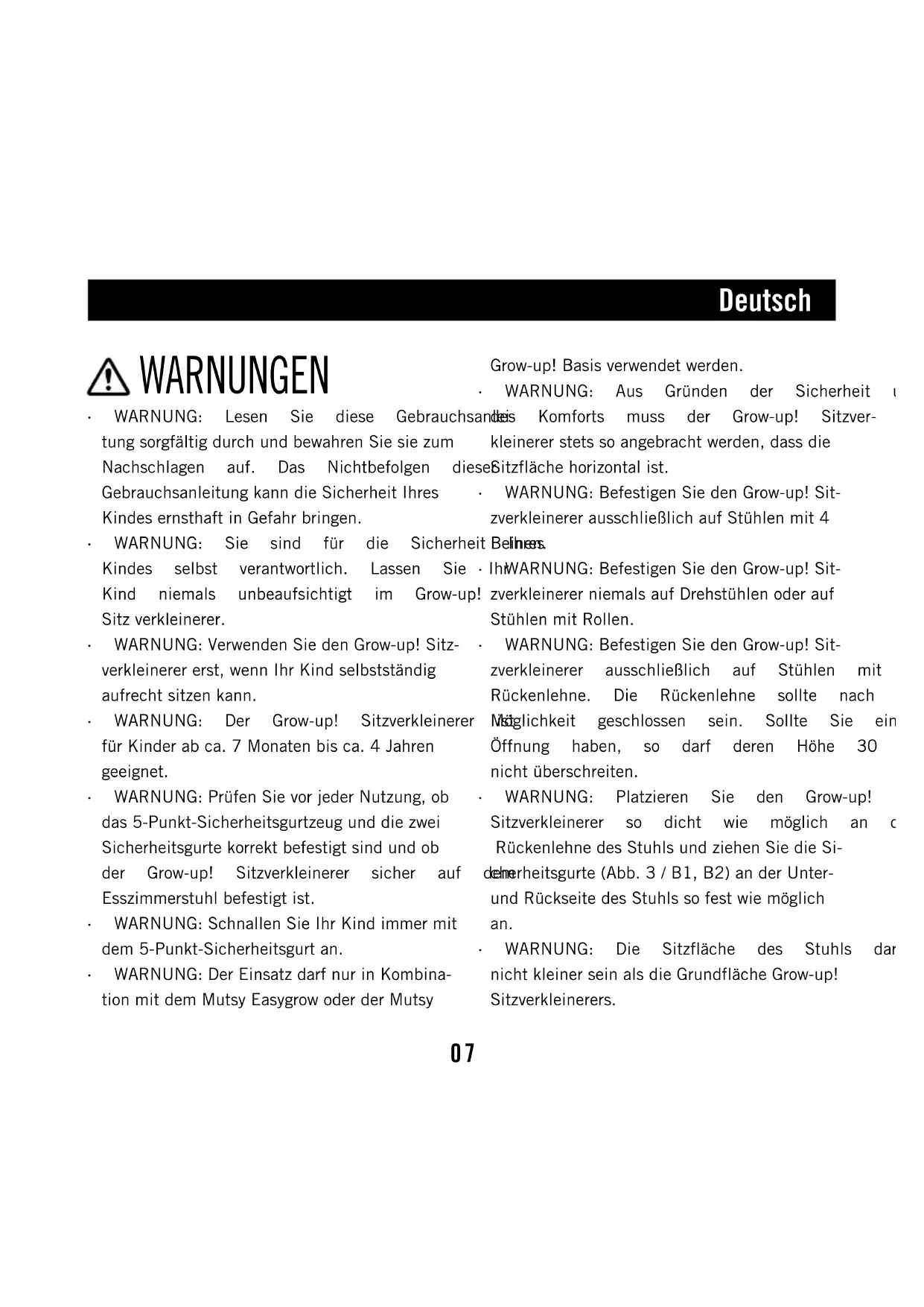 - WARNUNG: Lassen Sie Ihr Kind niemals Det Mutsy Grow-up! Sitzverkleinerer ist aus undem Grow-up! Sitzverkleinerer spielen, wengiftigen Materialien hergestellt und entspricht dieser nicht in Gebrauch ist. der Norm EN71-3.