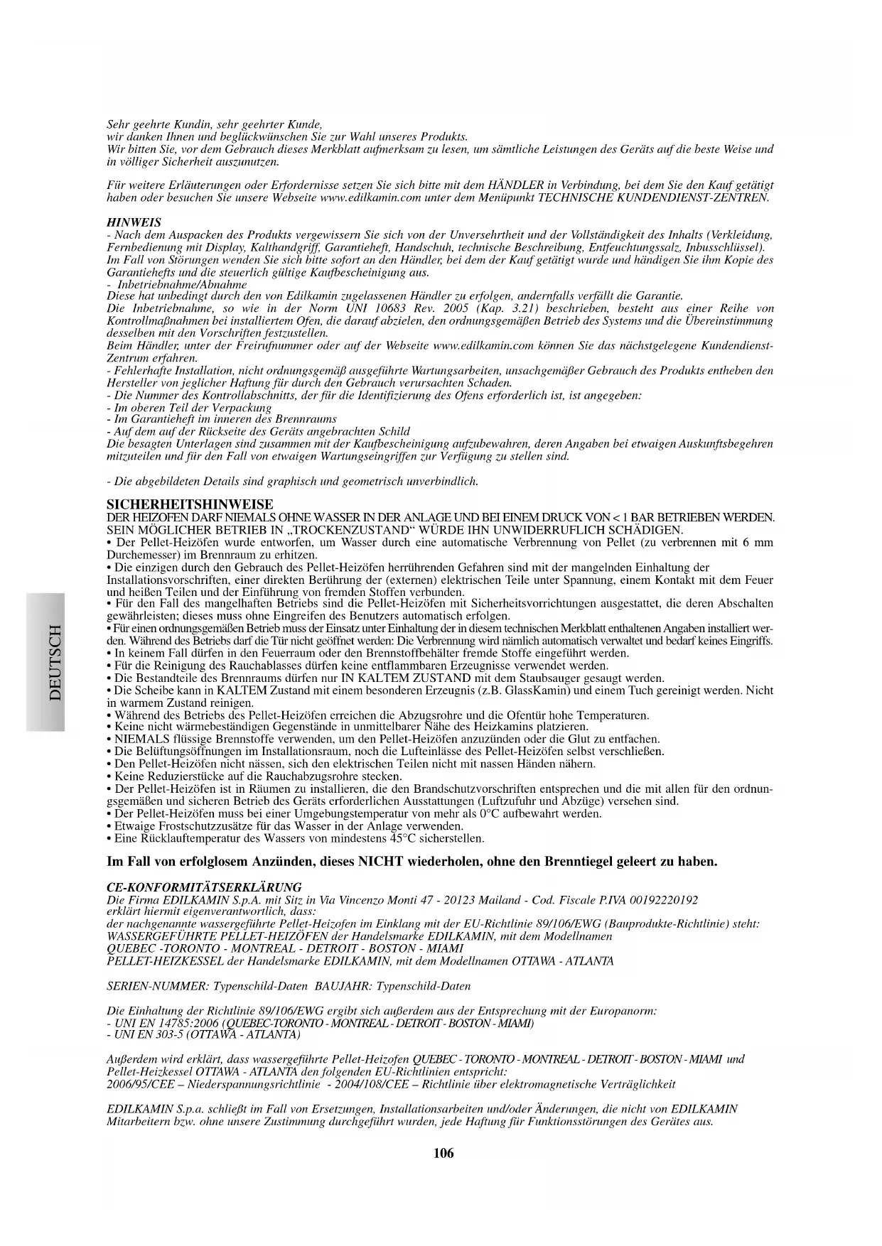 Die Firma EDILKAMIN S.p.A. mit Sitz in Via Vincenzo Monti 47 - 20123 Mailand - Cod. Fiscale P.IVA 00192220192 erklärt hiermit eigenverantwortlich, dass: der nachgenannte wassergeführte Pellet-Heizofen im Einklang mit der EU-Richtlinie 89/106/EWG (Bauprodukte-Richtlinie) steht: WASSERGEFÜHRTE PELLET-HEIZÖFEN der Handelsmarke EDILKAMIN, mit dem Modellnamen QUEBEC -TORONTO - MONTREAL - DETROIT - BOSTON - MIAMI PELLET-HEIZKESSEL der Handelsmarke EDILKAMIN, mit dem Modellnamen OTTAWA - ATLANTA SERIEN-NUMMER: Typenschild-Daten BAUJAHR: Typenschild-Daten Die Einhaltung der Richtlinie 89/106/EWG ergibt sich außerdem aus der Entsprechung mit der Europanorm: - UNI EN 14785:2006 (QUEBEC-TORONTO - MONTREAL - DETROIT - BOSTON - MIAMI) - UNI EN 303-5 (OTTAWA - ATLANTA) Außerdem wird erklärt, dass wassergeführte Pellet-Heizofen QUEBEC - TORONTO - MONTREAL - DETROIT - BOSTON - MIAMI und Pellet-Heizkessel OTTAWA - ATLANTA den folgenden EU-Richtlinien entspricht: 2006/95/CEE – Niederspannungsrichtlinie - 2004/108/CEE – Richtlinie über elektromagnetische Verträglichkeit EDILKAMIN S.p.a. schließt im Fall von Ersetzungen, Installationsarbeiten und/oder Änderungen, die nicht von EDILKAMIN Mitarbeitern bzw. ohne unsere Zustimmung durchgeführt wurden, jede Haftung für Funktionsstörungen des Gerätes aus. Sk multi EXTRA_LINE_24_33_cod_664550_versione E - 21 09 2011.qxp 21/09/2011 12.05 Pagina 107107 DEUTSCH ABMESSUNGEN