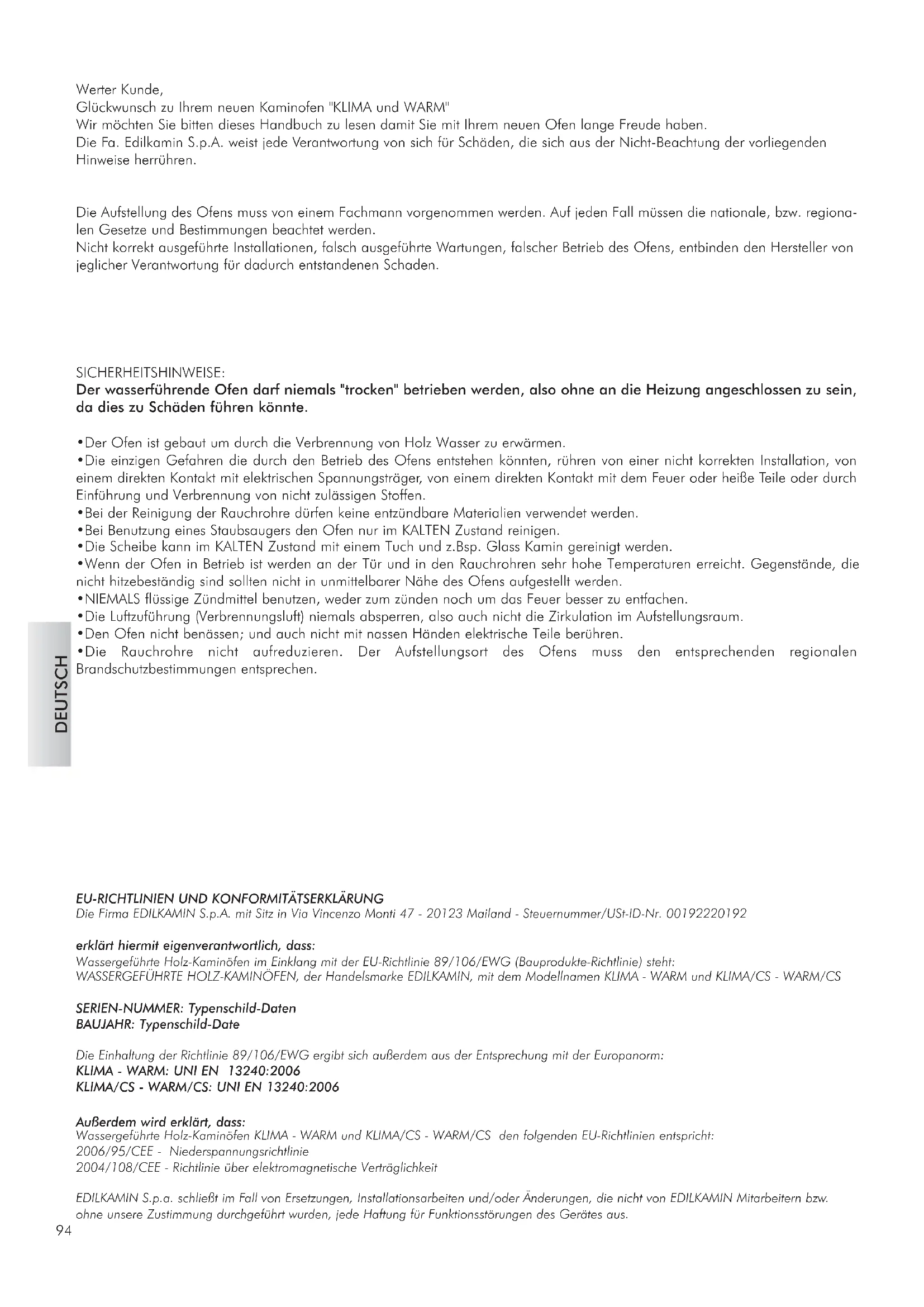 KLIMA/CS - WARM/CS: UNI EN 13240:2006 Außerdem wird erklärt, dass: Wassergeführte Holz-Kaminöfen KLIMA - WARM und KLIMA/CS - WARM/CS den folgenden EU-Richtlinien entspricht: 2006/95/CEE - Niederspannungsrichtlinie 2004/108/CEE - Richtlinie über elektromagnetische Verträglichkeit EDILKAMIN S.p.a. schließt im Fall von Ersetzungen, Installationsarbeiten und/oder Änderungen, die nicht von EDILKAMIN Mitarbeitern bzw. ohne unsere Zustimmung durchgeführt wurden, jede Haftung für Funktionsstörungen des Gerätes aus. SICHERHEITSHINWEISE: Der wasserführende Ofen darf niemals "trocken" betrieben werden, also ohne an die Heizung angeschlossen zu sein, da dies zu Schäden führen könnte.
