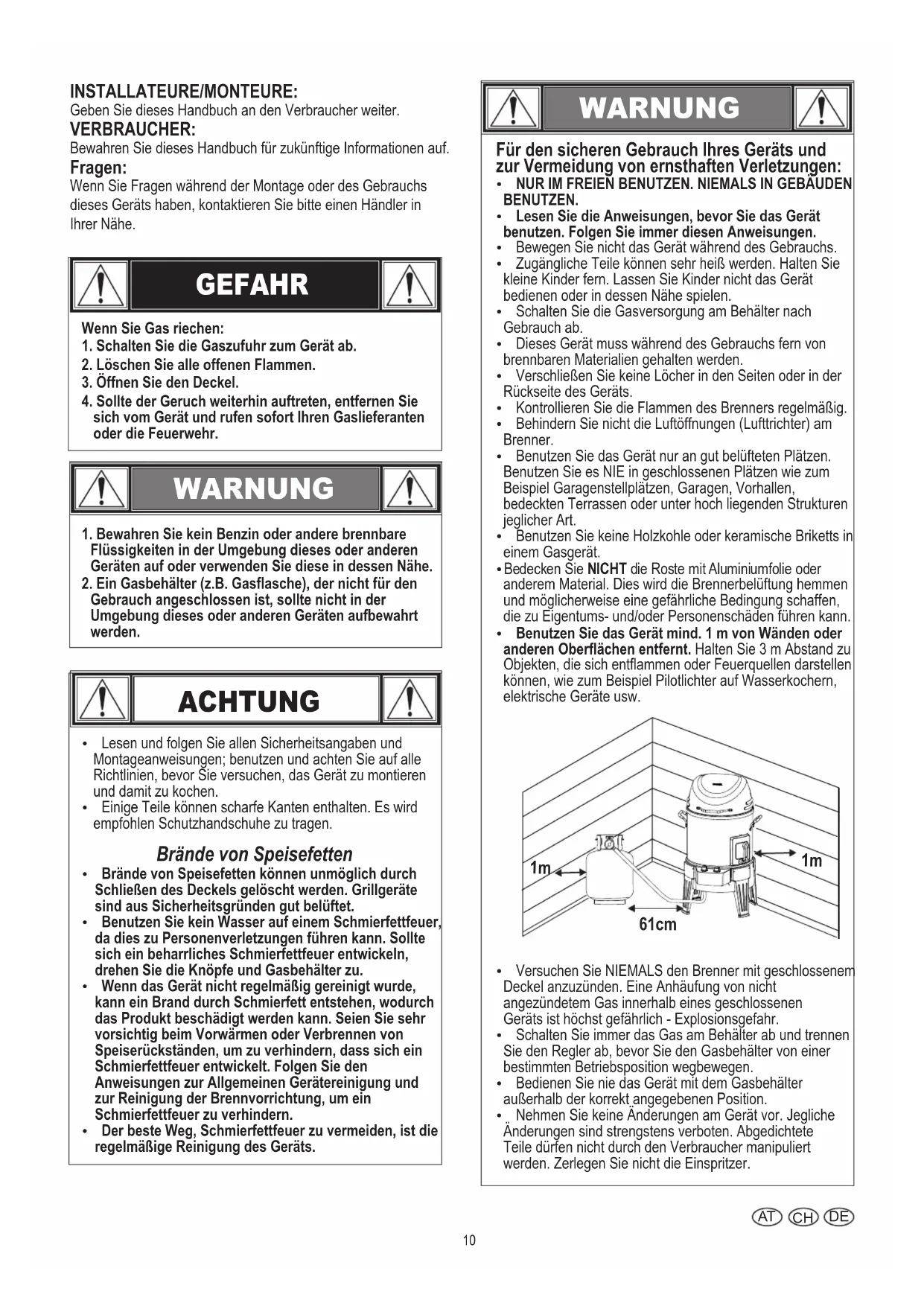 Déflecteur de chaleur Assemblage du panneau de commande Tube du brûleur Déposez les vis10 INSTALLATEURE/MONTEURE: Geben Sie dieses Handbuch an den Verbraucher weiter. VERBRAUCHER: Bewahren Sie dieses Handbuch für zukünftige Informationen auf. Fragen: Wenn Sie Fragen während der Montage oder des Gebrauchs dieses Geräts haben, kontaktieren Sie bitte einen Händler in Ihrer Nähe.Ÿ Lesen und folgen Sie allen Sicherheitsangaben und Montageanweisungen; benutzen und achten Sie auf alle Richtlinien, bevor Sie versuchen, das Gerät zu montieren und damit zu kochen.Ÿ Einige Teile können scharfe Kanten enthalten. Es wird empfohlen Schutzhandschuhe zu tragen. Brände von Speisefetten Ÿ Brände von Speisefetten können unmöglich durch Schließen des Deckels gelöscht werden. Grillgeräte sind aus Sicherheitsgründen gut belüftet.Ÿ Benutzen Sie kein Wasser auf einem Schmierfettfeuer, da dies zu Personenverletzungen führen kann. Sollte sich ein beharrliches Schmierfettfeuer entwickeln, drehen Sie die Knöpfe und Gasbehälter zu.Ÿ Wenn das Gerät nicht regelmäßig gereinigt wurde, kann ein Brand durch Schmierfett entstehen, wodurch das Produkt beschädigt werden kann. Seien Sie sehr vorsichtig beim Vorwärmen oder Verbrennen von Speiserückständen, um zu verhindern, dass sich ein Schmierfettfeuer entwickelt. Folgen Sie den Anweisungen zur Allgemeinen Gerätereinigung und zur Reinigung der Brennvorrichtung, um ein Schmierfettfeuer zu verhindern.Ÿ Der beste Weg, Schmierfettfeuer zu vermeiden, ist die regelmäßige Reinigung des Geräts. ACHTUNG GEFAHR WARNUNG Wenn Sie Gas riechen:1. Schalten Sie die Gaszufuhr zum Gerät ab.2. Löschen Sie alle offenen Flammen.3. Öffnen Sie den Deckel.4. Sollte der Geruch weiterhin auftreten, entfernen Sie sich vom Gerät und rufen sofort Ihren Gaslieferanten oder die Feuerwehr.1. Bewahren Sie kein Benzin oder andere brennbare Flüssigkeiten in der Umgebung dieses oder anderen Geräten auf oder verwenden Sie diese in dessen Nähe.2. Ein Gasbehälter (z.B. Gasflasche), der nicht für den Gebrauch angeschlossen ist, sollte nicht in der Umgebung dieses oder anderen Geräten aufbewahrt werden. WARNUNG Für den sicheren Gebrauch Ihres Geräts und zur Vermeidung von ernsthaften Verletzungen: Ÿ NUR IM FREIEN BENUTZEN. NIEMALS IN GEBÄUDEN BENUTZEN.Ÿ Lesen Sie die Anweisungen, bevor Sie das Gerät benutzen. Folgen Sie immer diesen Anweisungen.Ÿ Bewegen Sie nicht das Gerät während des Gebrauchs.Ÿ Zugängliche Teile können sehr heiß werden. Halten Sie kleine Kinder fern. Lassen Sie Kinder nicht das Gerät bedienen oder in dessen Nähe spielen.Ÿ Schalten Sie die Gasversorgung am Behälter nach Gebrauch ab.Ÿ Dieses Gerät muss während des Gebrauchs fern von brennbaren Materialien gehalten werden.Ÿ Verschließen Sie keine Löcher in den Seiten oder in der Rückseite des Geräts.Ÿ Kontrollieren Sie die Flammen des Brenners regelmäßig.Ÿ Behindern Sie nicht die Luftöffnungen (Lufttrichter) am Brenner.Ÿ Benutzen Sie das Gerät nur an gut belüfteten Plätzen. Benutzen Sie es NIE in geschlossenen Plätzen wie zum Beispiel Garagenstellplätzen, Garagen, Vorhallen, bedeckten Terrassen oder unter hoch liegenden Strukturen jeglicher Art.Ÿ Benutzen Sie keine Holzkohle oder keramische Briketts in einem Gasgerät. Ÿ Bedecken Sie NICHT die Roste mit Aluminiumfolie oder anderem Material. Dies wird die Brennerbelüftung hemmen und möglicherweise eine gefährliche Bedingung schaffen, die zu Eigentums- und/oder Personenschäden führen kann.Ÿ Benutzen Sie das Gerät mind. 1 m von Wänden oder anderen Oberflächen entfernt. Halten Sie 3 m Abstand zu Objekten, die sich entflammen oder Feuerquellen darstellen können, wie zum Beispiel Pilotlichter auf Wasserkochern, elektrische Geräte usw.Ÿ Versuchen Sie NIEMALS den Brenner mit geschlossenem Deckel anzuzünden. Eine Anhäufung von nicht angezündetem Gas innerhalb eines geschlossenen Geräts ist höchst gefährlich - Explosionsgefahr. Ÿ Schalten Sie immer das Gas am Behälter ab und trennen Sie den Regler ab, bevor Sie den Gasbehälter von einer bestimmten Betriebsposition wegbewegen.Ÿ Bedienen Sie nie das Gerät mit dem Gasbehälter außerhalb der korrekt angegebenen Position.Ÿ Nehmen Sie keine Änderungen am Gerät vor. Jegliche Änderungen sind strengstens verboten. Abgedichtete Teile dürfen nicht durch den Verbraucher manipuliert werden. Zerlegen Sie nicht die Einspritzer.