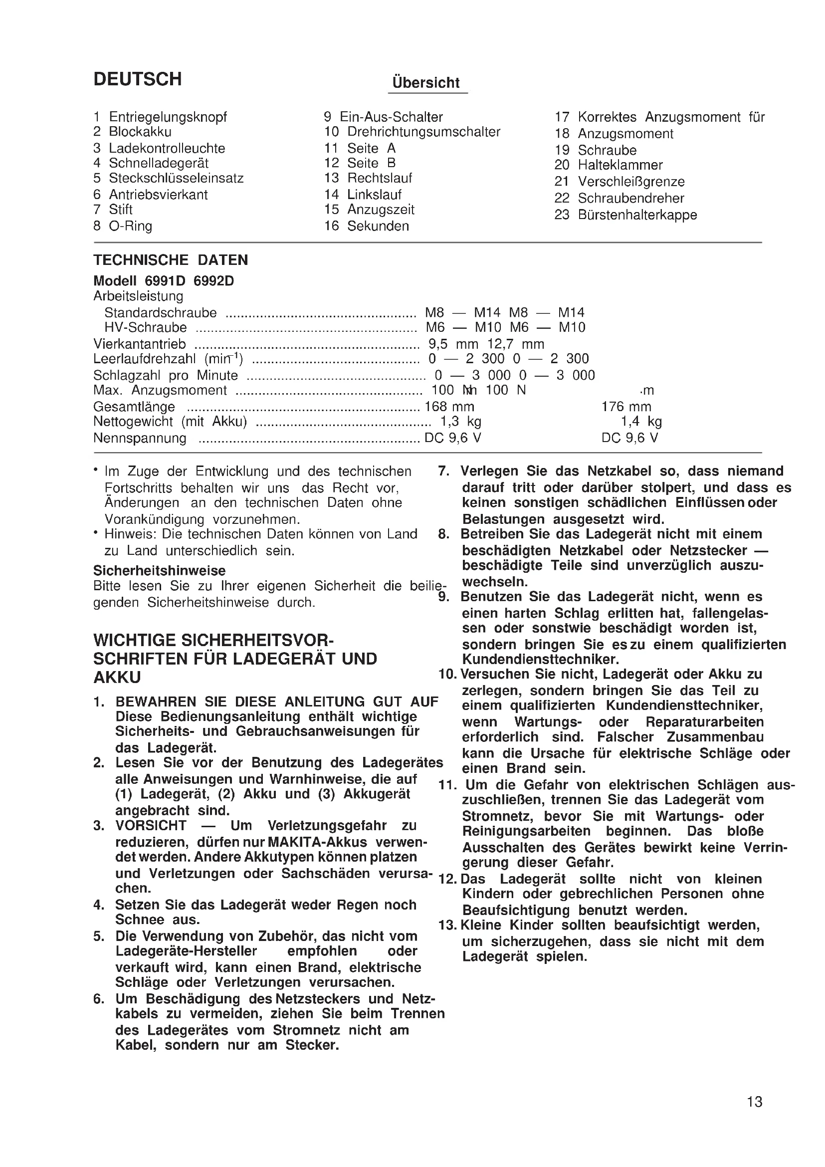 Übersicht 1 Entriegelungsknopf 2 Blockakku 3 Ladekontrolleuchte 4 Schnelladegerät 5 Steckschlüsseleinsatz 6 Antriebsvierkant 7 Stift 8 O-Ring 9 Ein-Aus-Schalter 10 Drehrichtungsumschalter 11 Seite A 12 Seite B 13 Rechtslauf 14 Linkslauf 15 Anzugszeit 16 Sekunden 17 Korrektes Anzugsmoment für 18 Anzugsmoment 19 Schraube 20 Halteklammer 21 Verschleißgrenze 22 Schraubendreher 23 Bürstenhalterkappe TECHNISCHE DATEN Modell 6991D 6992D Arbeitsleistung Standardschraube .................................................. M8 — M14 M8 — M14 HV-Schraube .......................................................... M6 — M10 M6 — M10 Vierkantantrieb ........................................................... 9,5 mm 12,7 mm Leerlaufdrehzahl (min