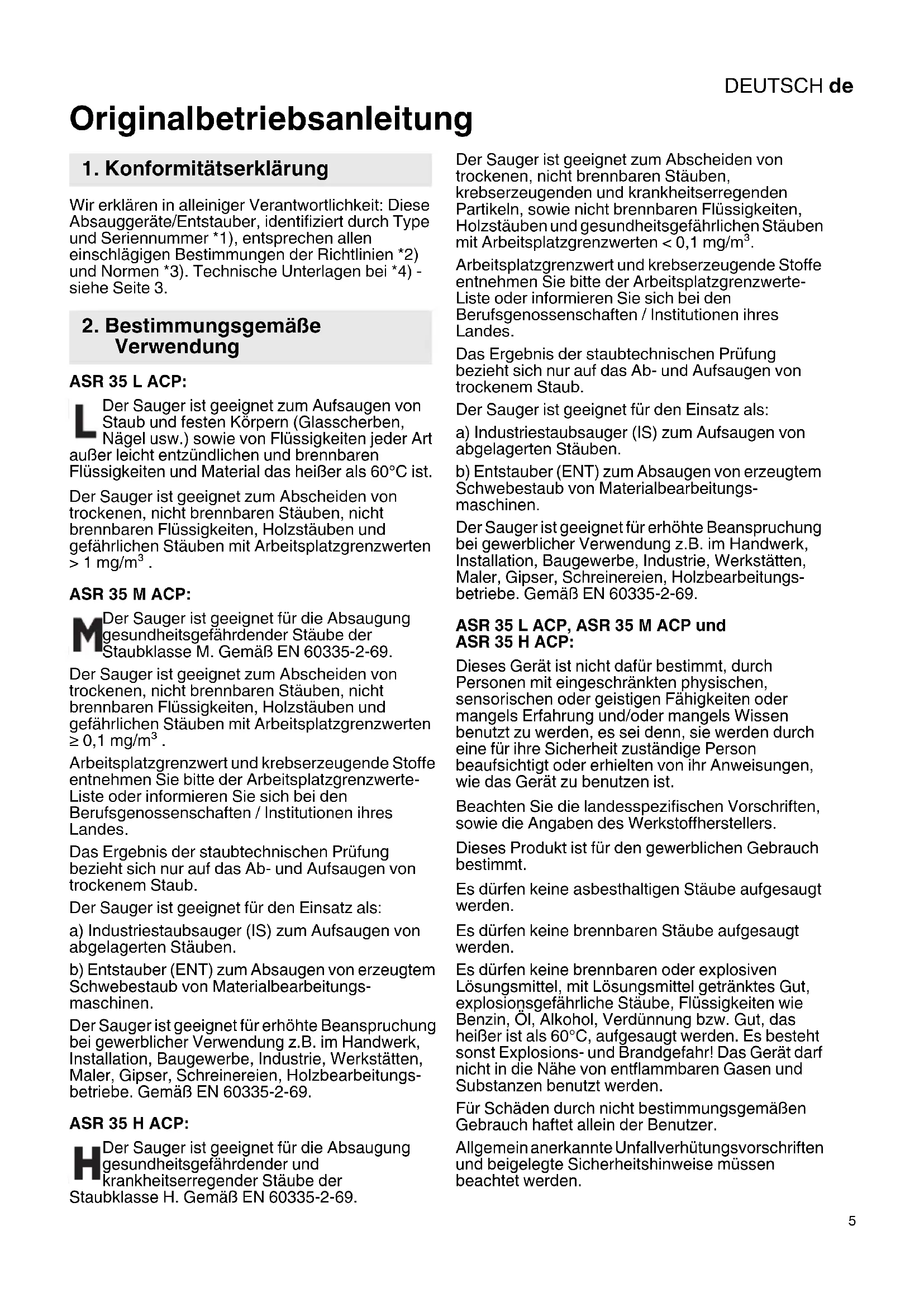 Originalbetriebsanleitung Wir erklären in alleiniger Verantwortlichkeit: Diese Absauggeräte/Entstauber, identifiziert durch Type und Seriennummer *1), entsprechen allen einschlägigen Bestimmungen der Richtlinien *2) und Normen *3). Technische Unterlagen bei *4) - siehe Seite 3. ASR 35 L ACP: Der Sauger ist geeignet zum Aufsaugen von Staub und festen Körpern (Glasscherben, Nägel usw.) sowie von Flüssigkeiten jeder Art außer leicht entzündlichen und brennbaren Flüssigkeiten und Material das heißer als 60°C ist. Der Sauger ist geeignet zum Abscheiden von trockenen, nicht brennbaren Stäuben, nicht brennbaren Flüssigkeiten, Holzstäuben und gefährlichen Stäuben mit Arbeitsplatzgrenzwerten > 1 mg/m³ . ASR 35 M ACP: Der Sauger ist geeignet für die Absaugung gesundheitsgefährdender Stäube der Staubklasse M. Gemäß EN 60335-2-69. Der Sauger ist geeignet zum Abscheiden von trockenen, nicht brennbaren Stäuben, nicht brennbaren Flüssigkeiten, Holzstäuben und gefährlichen Stäuben mit Arbeitsplatzgrenzwerten ≥ 0,1 mg/m³ . Arbeitsplatzgrenzwert und krebserzeugende Stoffe entnehmen Sie bitte der Arbeitsplatzgrenzwerte- Liste oder informieren Sie sich bei den Berufsgenossenschaften / Institutionen ihres Landes. Das Ergebnis der staubtechnischen Prüfung bezieht sich nur auf das Ab- und Aufsaugen von trockenem Staub. Der Sauger ist geeignet für den Einsatz als: a) Industriestaubsauger (IS) zum Aufsaugen von abgelagerten Stäuben. b) Entstauber (ENT) zum Absaugen von erzeugtem Schwebestaub von Materialbearbeitungs- maschinen. Der Sauger ist geeignet für erhöhte Beanspruchung bei gewerblicher Verwendung z.B. im Handwerk, Installation, Baugewerbe, Industrie, Werkstätten, Maler, Gipser, Schreinereien, Holzbearbeitungs- betriebe. Gemäß EN 60335-2-69. ASR 35 H ACP: Der Sauger ist geeignet für die Absaugung gesundheitsgefährdender und krankheitserregender Stäube der Staubklasse H. Gemäß EN 60335-2-69. Der Sauger ist geeignet zum Abscheiden von trockenen, nicht brennbaren Stäuben, krebserzeugenden und krankheitserregenden Partikeln, sowie nicht brennbaren Flüssigkeiten, Holzstäuben und gesundheitsgefährlichen Stäuben mit Arbeitsplatzgrenzwerten < 0,1 mg/m³. Arbeitsplatzgrenzwert und krebserzeugende Stoffe entnehmen Sie bitte der Arbeitsplatzgrenzwerte- Liste oder informieren Sie sich bei den Berufsgenossenschaften / Institutionen ihres Landes. Das Ergebnis der staubtechnischen Prüfung bezieht sich nur auf das Ab- und Aufsaugen von trockenem Staub. Der Sauger ist geeignet für den Einsatz als: a) Industriestaubsauger (IS) zum Aufsaugen von abgelagerten Stäuben. b) Entstauber (ENT) zum Absaugen von erzeugtem Schwebestaub von Materialbearbeitungs- maschinen. Der Sauger ist geeignet für erhöhte Beanspruchung bei gewerblicher Verwendung z.B. im Handwerk, Installation, Baugewerbe, Industrie, Werkstätten, Maler, Gipser, Schreinereien, Holzbearbeitungs- betriebe. Gemäß EN 60335-2-69. ASR 35 L ACP, ASR 35 M ACP und ASR 35 H ACP: Dieses Gerät ist nicht dafür bestimmt, durch Personen mit eingeschränkten physischen, sensorischen oder geistigen Fähigkeiten oder mangels Erfahrung und/oder mangels Wissen benutzt zu werden, es sei denn, sie werden durch eine für ihre Sicherheit zuständige Person beaufsichtigt oder erhielten von ihr Anweisungen, wie das Gerät zu benutzen ist. Beachten Sie die landesspezifischen Vorschriften, sowie die Angaben des Werkstoffherstellers. Dieses Produkt ist für den gewerblichen Gebrauch bestimmt. Es dürfen keine asbesthaltigen Stäube aufgesaugt werden. Es dürfen keine brennbaren Stäube aufgesaugt werden. Es dürfen keine brennbaren oder explosiven Lösungsmittel, mit Lösungsmittel getränktes Gut, explosionsgefährliche Stäube, Flüssigkeiten wie Benzin, Öl, Alkohol, Verdünnung bzw. Gut, das heißer ist als 60°C, aufgesaugt werden. Es besteht sonst Explosions- und Brandgefahr! Das Gerät darf nicht in die Nähe von entflammbaren Gasen und Substanzen benutzt werden. Für Schäden durch nicht bestimmungsgemäßen Gebrauch haftet allein der Benutzer. Allgemein anerkannte Unfallverhütungsvorschriften und beigelegte Sicherheitshinweise müssen beachtet werden.