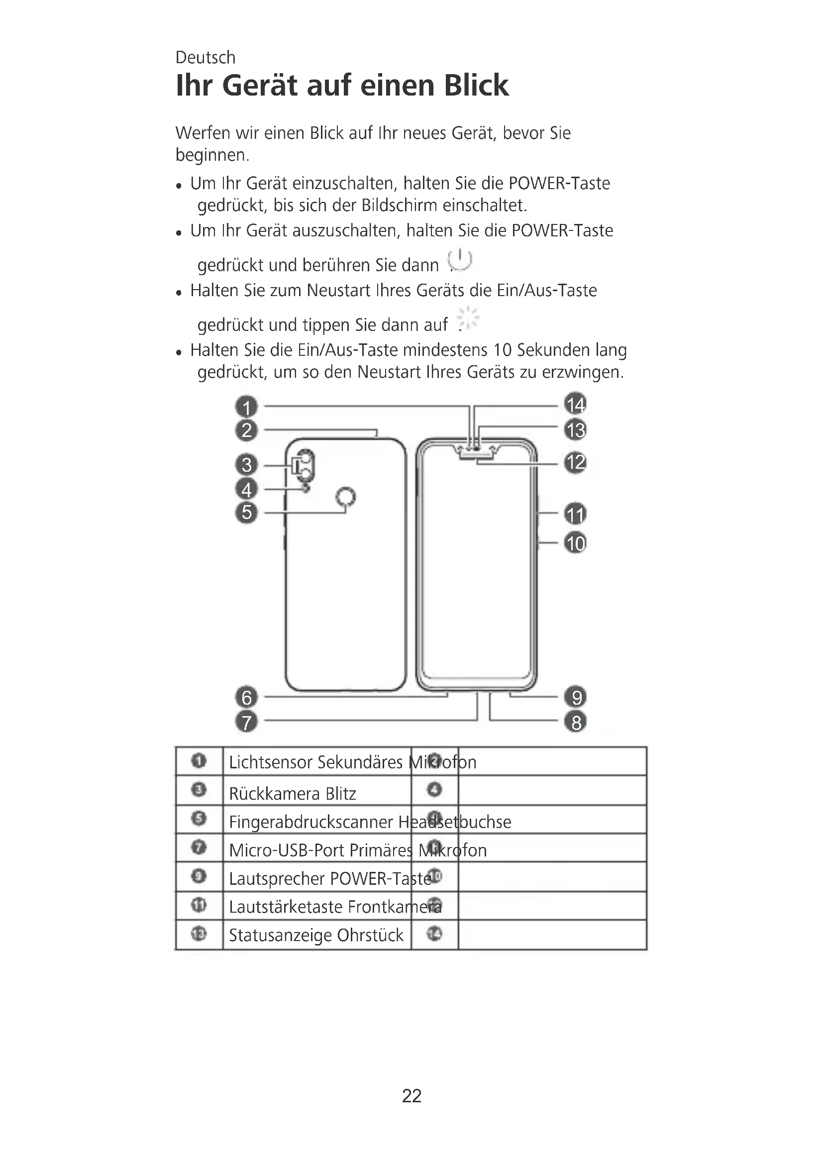 Halten Sie die Ein/Aus-Taste mindestens 10 Sekunden lang gedrückt, um so den Neustart Ihr's Geräts zu erzwingen.