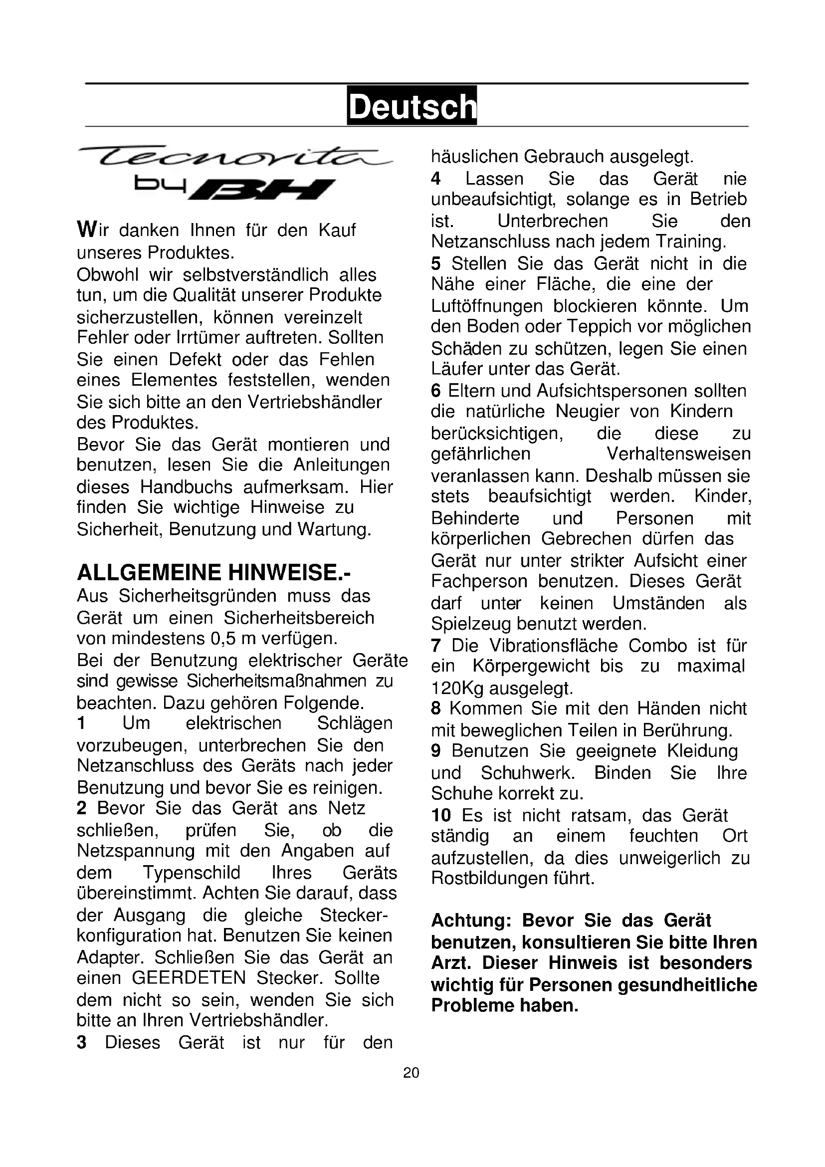 Achtung: Bevor Sie das Gerät benutzen, konsultieren Sie bitte Ihren Arzt. Dieser Hinweis ist besonders wichtig für Personen gesundheitliche Probleme haben.