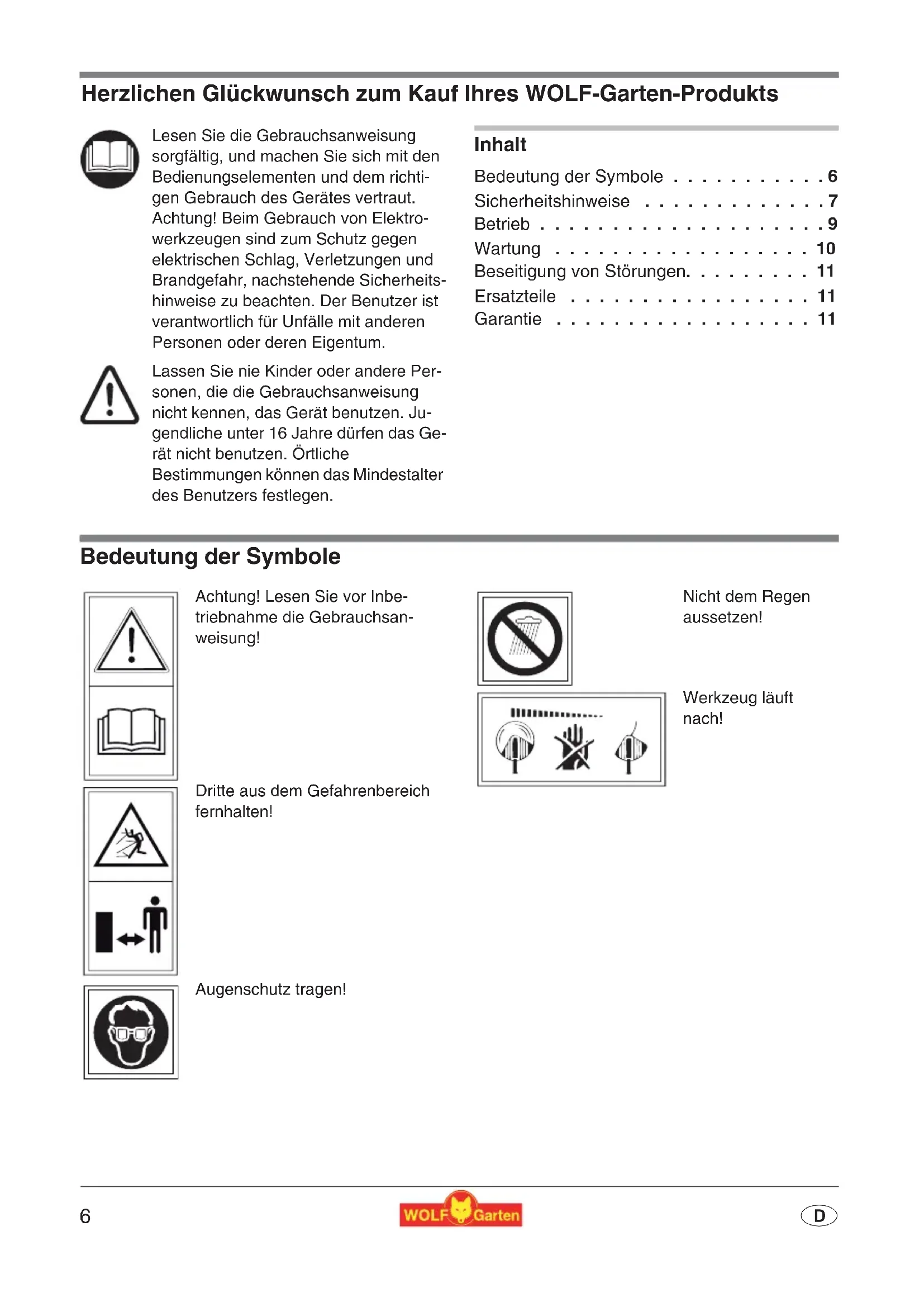 - D Herzlichen Glückwunsch zum Kauf Ihres WOLF-Garten-Produkts Inhalt Bedeutung der Symbole p. 6