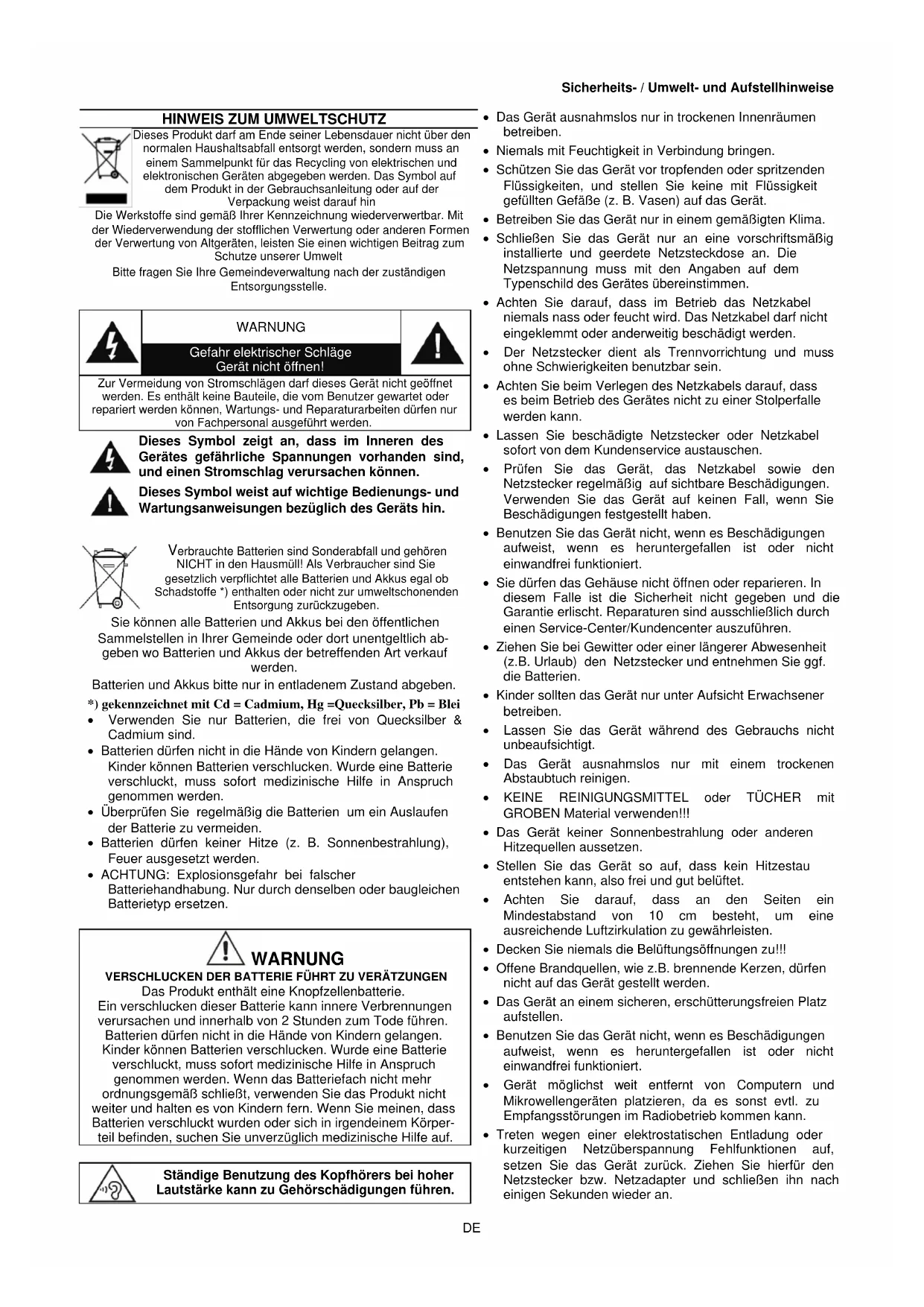 Verwenden Sie nur Batterien, die frei von Quecksilber & Cadmium sind. Batterien dürfen nicht in die Hände von Kindern gelangen. Kinder können Batterien verschlucken. Wurde eine Batterie verschluckt, muss sofort medizinische Hilfe in Anspruch genommen werden. Überprüfen Sie regelmäßig die Batterien um ein Auslaufen der Batterie zu vermeiden. Batterien dürfen keiner Hitze (z. B. Sonnenbestrahlung), Feuer ausgesetzt werden. ACHTUNG: Explosionsgefahr bei falscher Batteriehandhabung. Nur durch denselben oder baugleichen Batterietyp ersetzen.