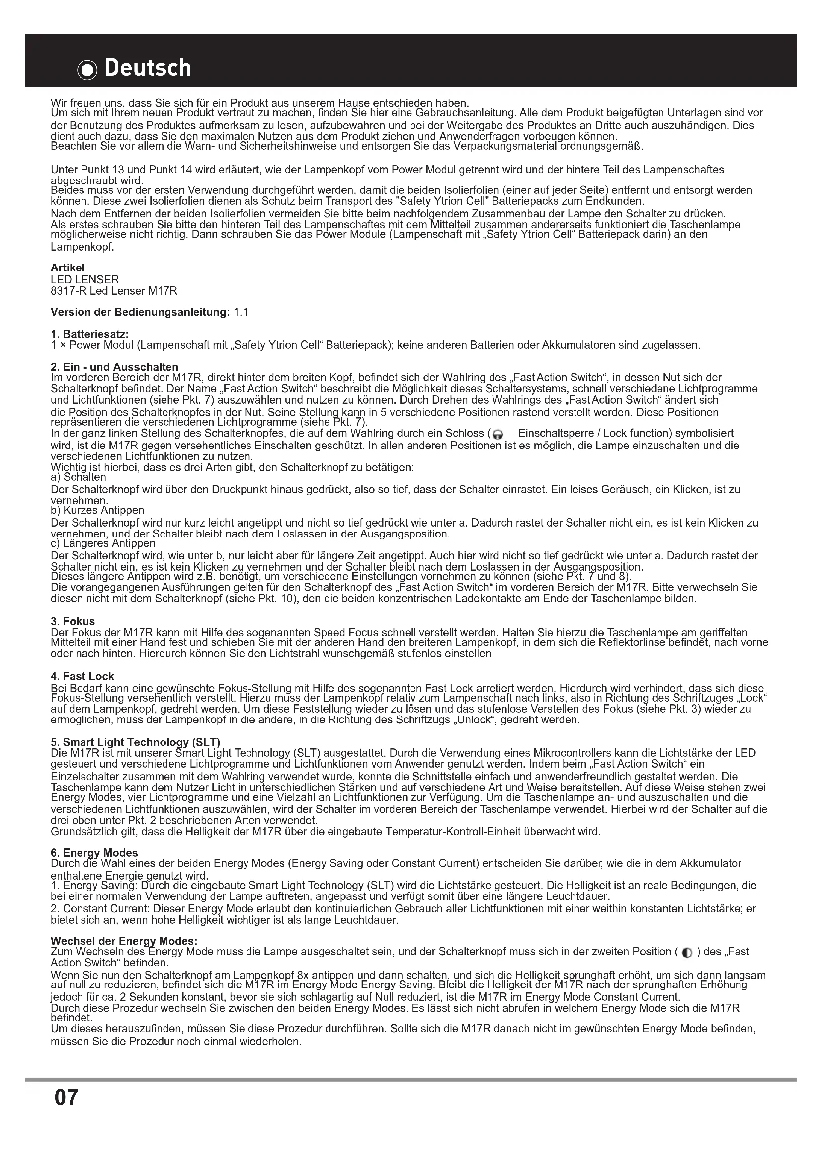 Bitten lden Sie die aufladbare Batterie rechtzeitig auf. Verhalt sich das Power Modul untypisch, wechseln Sie dieses bitte. Zum Wechsein des Akkumulators schalten Sie unbedingt zuerst die Taschenlampe aus und schrauben Sie dann den Teil hinter dem "Fast Action Switch" ab. Auf die Weise trennen Sie den Lampenkopf vom Power Modul (Lampenschaft mit „Safety Ytrion Cell" Batteriepack). Für die Entsorgung des verbrauchten Power Modus lesen Sieitte Pkt 14.