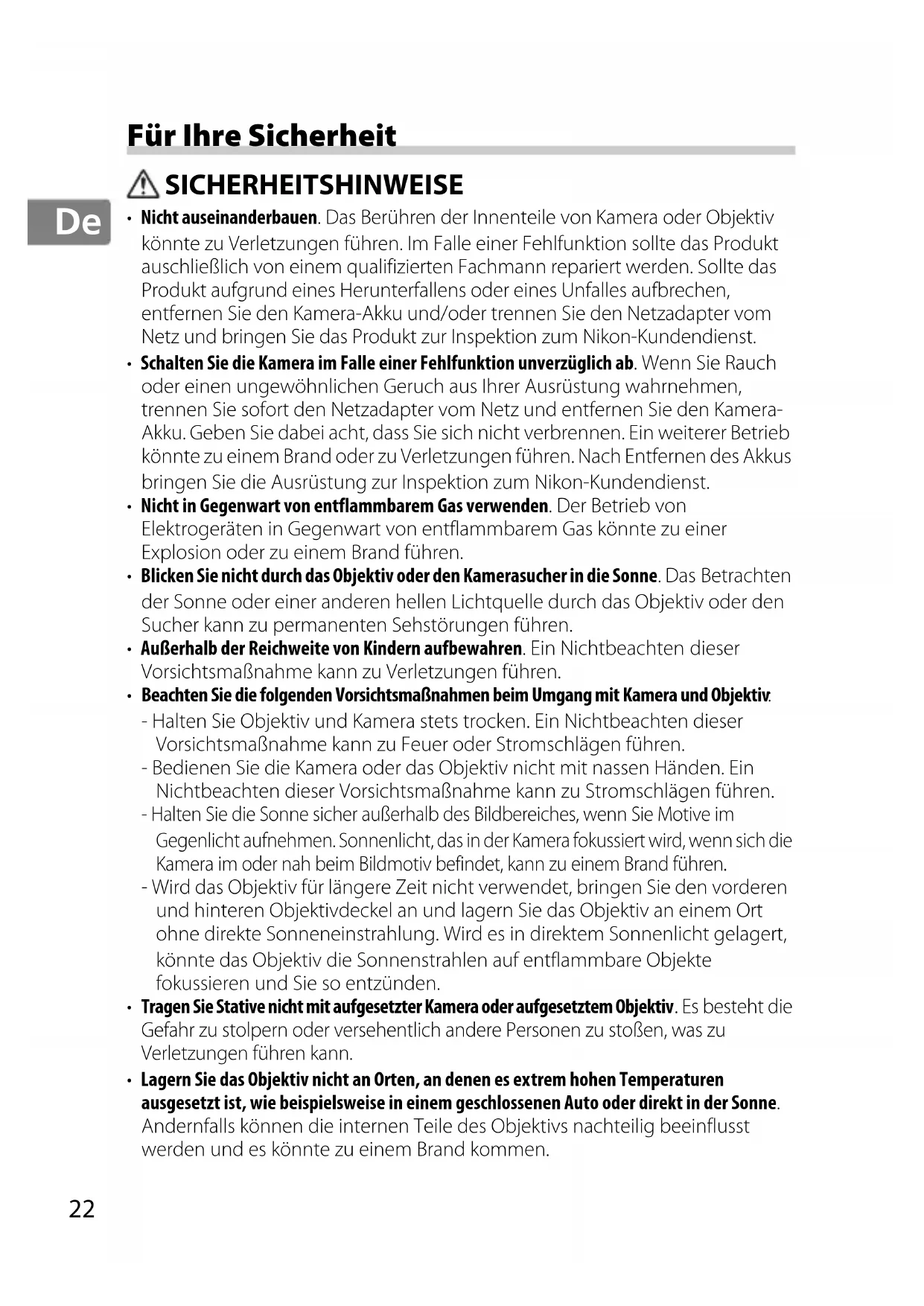- Nicht auseinanderbauen. Das Berühren der Innenteile von Kamera oder Objektiv könnte zu Verletzungen führen. Im Falle einer Fehlfunktion sollte das Produkt auschließlich von einem qualifizierten Fachmann repariert werden. Sollte das Produkt aufgrund eines Herunterfallens oder eines Unfalles aufbrechen, entfernen Sie den Kamera-Akku und/oder trennen Sie den Netzadapter vom Netz und bringen Sie das Produkt zur Inspektion zum Nikon-Kundendienst.