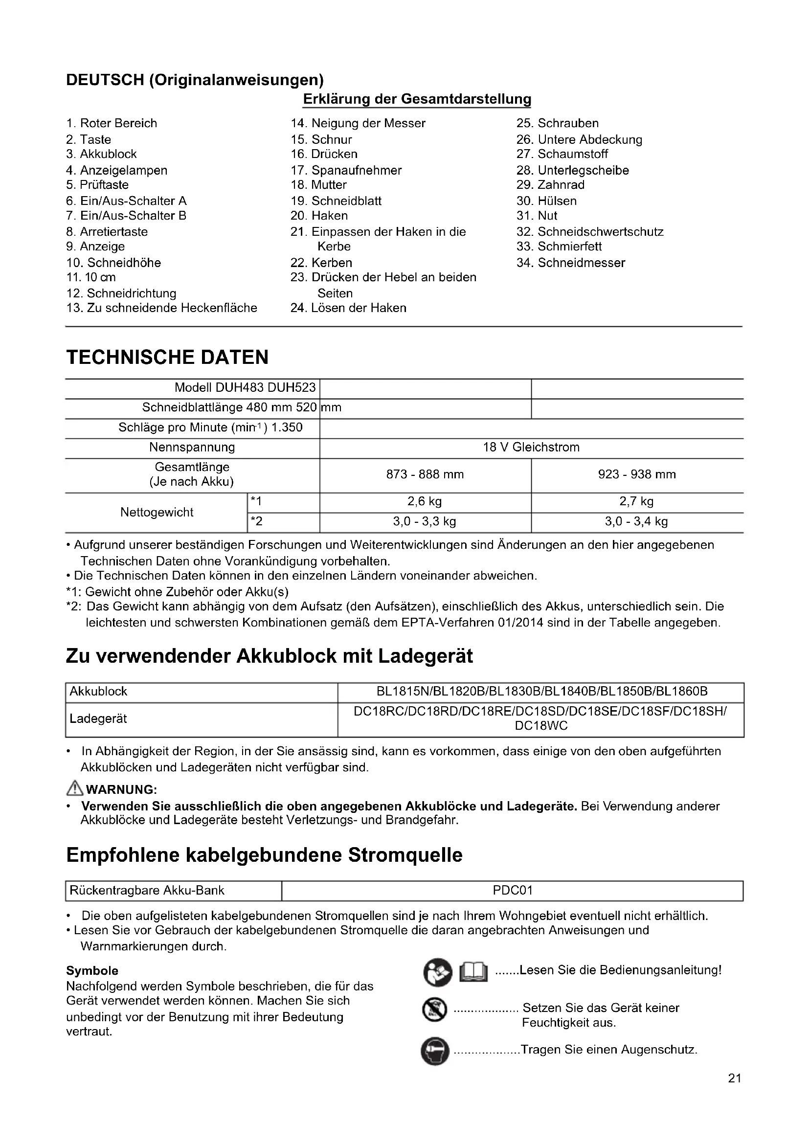 Nettogewicht *1 2,6 kg 2,7 kg *2 3,0 - 3,3 kg 3,0 - 3,4 kg Akkublock BL1815N/BL1820B/BL1830B/BL1840B/BL1850B/BL1860B Ladegerät DC18RC/DC18RD/DC18RE/DC18SD/DC18SE/DC18SF/DC18SH/ DC18WC Rückentragbare Akku-Bank PDC0122 ................... GEFAHR- Halten Sie Ihre Hände vom Messer fern. ................... Augen- und Gehörschutz tragen. ................... Setzen Sie das Gerät keinem Regen aus. ............ Nur für EU-Länder Aufgrund des Vorhandenseins gefährlicher Komponenten in der Ausrüstung können Elektro- und Elektronik-Altgeräte, Akkumulatoren und Batterien sich negativ auf die Umwelt und die menschliche Gesundheit auswirken. Entsorgen Sie Elektro- und Elektronikgeräte oder Batterien nicht mit dem Hausmüll! In Übereinstimmung mit der Europäischen Richtlinie über Elektro- und Elektronik-Altgeräte, Akkumulatoren und Batterien, verbrauchte Akkumulatoren und Batterien sowie ihrer Anpassung an nationales Recht sollten Elektro- Altgeräte, Batterien und Akkumulatoren gemäß den Umweltschutzbestimmungen getrennt gelagert und zu einer getrennten Sammelstelle für Siedlungsabfälle geliefert werden. Dies wird durch das am Gerät angebrachte Symbol der durchgestrichenen Abfalltonne auf Rädern angezeigt. ................. Garantierter Schallleistungspegel gemäß der EU-Richtlinie über Außenlärm. ................. Schallleistungspegel gemäß der australischen NSW- Lärmschutzverordnung Verwendungszweck ENE014-1 Das Gerät wurde für das Schneiden von Hecken entwickelt. Allgemeine Sicherheitswarnungen für Elektrowerkzeuge GEA010-2 WARNUNG: Lesen Sie alle mit diesem Elektrowerkzeug gelieferten Sicherheitswarnungen, Anweisungen, Abbildungen und technischen Daten durch. Eine Missachtung der unten aufgeführten Anweisungen kann zu einem elektrischen Schlag, Brand und/oder schweren Verletzungen führen. Bewahren Sie alle Warnungen und Anweisungen für spätere Bezugnahme auf. Der Ausdruck „Elektrowerkzeug“ in den Warnhinweisen bezieht sich auf Ihr mit Netzstrom (mit Kabel) oder Akku (ohne Kabel) betriebenes Elektrowerkzeug. Sicherheitswarnungen für Akku- Heckenschere GEB278-1