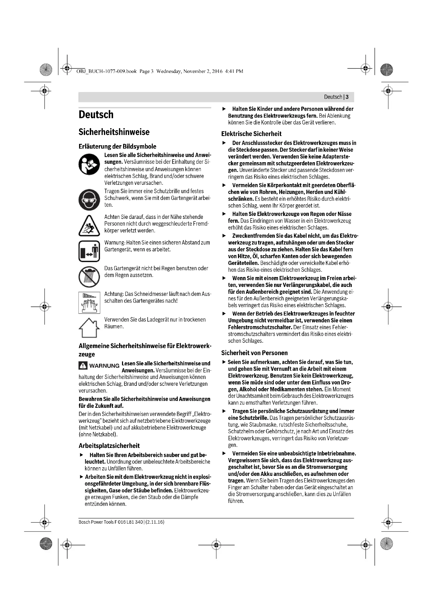 ro Instrucţiuni originale bg Оригинална инструкция mk Оригинално упатство за работа sr Originalno uputstvo za rad sl Izvirna navodila hr Originalne upute za rad et Algupärane kasutusjuhend lv Instrukcijas oriģinālvalodā lt Originali instrukcija OBJ_BUCH-1077-009.book Page 1 Monday, September 26, 2016 2:24 PM2 | F 016 L81 340 | (26.9.16) Bosch Power Tools Deutsch . . . . . . . . . . . . . . . . . . . . . . . . . . . . . . . . . . . . . . . . . Seite 3 English . . . . . . . . . . . . . . . . . . . . . . . . . . . . . . . . . . . . . . . . . . Page 10 Français . . . . . . . . . . . . . . . . . . . . . . . . . . . . . . . . . . . . . . . . . Page 18 Español . . . . . . . . . . . . . . . . . . . . . . . . . . . . . . . . . . . . . . . . Página 25 Português. . . . . . . . . . . . . . . . . . . . . . . . . . . . . . . . . . . . . . . Página 33 Italiano . . . . . . . . . . . . . . . . . . . . . . . . . . . . . . . . . . . . . . . . . Pagina 41 Nederlands . . . . . . . . . . . . . . . . . . . . . . . . . . . . . . . . . . . . . Pagina 49 Dansk . . . . . . . . . . . . . . . . . . . . . . . . . . . . . . . . . . . . . . . . . . . Side 56 Svenska . . . . . . . . . . . . . . . . . . . . . . . . . . . . . . . . . . . . . . . . . Sida 63 Norsk . . . . . . . . . . . . . . . . . . . . . . . . . . . . . . . . . . . . . . . . . . . Side 70 Suomi. . . . . . . . . . . . . . . . . . . . . . . . . . . . . . . . . . . . . . . . . . . . Sivu 77 Ελληνικά. . . . . . . . . . . . . . . . . . . . . . . . . . . . . . . . . . . . . . . . Σελίδα 83 Türkçe . . . . . . . . . . . . . . . . . . . . . . . . . . . . . . . . . . . . . . . . . Sayfa 91 Polski . . . . . . . . . . . . . . . . . . . . . . . . . . . . . . . . . . . . . . . . . . Strona 99 Česky . . . . . . . . . . . . . . . . . . . . . . . . . . . . . . . . . . . . . . . . . . Strana 107 Slovensky. . . . . . . . . . . . . . . . . . . . . . . . . . . . . . . . . . . . . . . Strana 114 Magyar . . . . . . . . . . . . . . . . . . . . . . . . . . . . . . . . . . . . . . . . . . Oldal 122 Русский . . . . . . . . . . . . . . . . . . . . . . . . . . . . . . . . . . . . . Страница 130 Українська. . . . . . . . . . . . . . . . . . . . . . . . . . . . . . . . . . . Сторінка 140 Қазақша. . . . . . . . . . . . . . . . . . . . . . . . . . . . . . . . . . . . . . . . . . .Бет 148 Română . . . . . . . . . . . . . . . . . . . . . . . . . . . . . . . . . . . . . . . . Pagina 157 Български . . . . . . . . . . . . . . . . . . . . . . . . . . . . . . . . . . . Страница 164 Македонски . . . . . . . . . . . . . . . . . . . . . . . . . . . . . . . . . . . Страна 173 Srpski. . . . . . . . . . . . . . . . . . . . . . . . . . . . . . . . . . . . . . . . . . Strana 180 Slovensko . . . . . . . . . . . . . . . . . . . . . . . . . . . . . . . . . . . . . . . Stran 187 Hrvatski . . . . . . . . . . . . . . . . . . . . . . . . . . . . . . . . . . . . . . Stranica 194 Eesti . . . . . . . . . . . . . . . . . . . . . . . . . . . . . . . . . . . . . . . . . Lehekülg 201 Latviešu . . . . . . . . . . . . . . . . . . . . . . . . . . . . . . . . . . . . . . Lappuse 208 Lietuviškai . . . . . . . . . . . . . . . . . . . . . . . . . . . . . . . . . . . . Puslapis 216 OBJ_BUCH-1077-009.book Page 2 Monday, September 26, 2016 2:24 PMDeutsch | 3 Bosch Power Tools F 016 L81 340 | (2.11.16) Deutsch Sicherheitshinweise Erläuterung der Bildsymbole Lesen Sie alle Sicherheitshinweise und Anwei- sungen. Versäumnisse bei der Einhaltung der Si- cherheitshinweise und Anweisungen können elektrischen Schlag, Brand und/oder schwere Verletzungen verursachen. Tragen Sie immer eine Schutzbrille und festes Schuhwerk, wenn Sie mit dem Gartengerät arbei- ten. Achten Sie darauf, dass in der Nähe stehende Personen nicht durch weggeschleuderte Fremd- körper verletzt werden. Warnung: Halten Sie einen sicheren Abstand zum Gartengerät, wenn es arbeitet. Das Gartengerät nicht bei Regen benutzen oder dem Regen aussetzen. Achtung: Das Schneidmesser läuft nach dem Aus- schalten des Gartengerätes nach! Verwenden Sie das Ladegerät nur in trockenen Räumen. Allgemeine Sicherheitshinweise für Elektrowerk- zeuge Lesen Sie alle Sicherheitshinweise und Anweisungen. Versäumnisse bei der Ein- haltung der Sicherheitshinweise und Anweisungen können elektrischen Schlag, Brand und/oder schwere Verletzungen verursachen. Bewahren Sie alle Sicherheitshinweise und Anweisungen für die Zukunft auf. Der in den Sicherheitshinweisen verwendete Begriff „Elektro- werkzeug“ bezieht sich auf netzbetriebene Elektrowerkzeuge (mit Netzkabel) und auf akkubetriebene Elektrowerkzeuge (ohne Netzkabel). Arbeitsplatzsicherheit Halten Sie Ihren Arbeitsbereich sauber und gut be- leuchtet. Unordnung oder unbeleuchtete Arbeitsbereiche können zu Unfällen führen. Arbeiten Sie mit dem Elektrowerkzeug nicht in explosi- onsgefährdeter Umgebung, in der sich brennbare Flüs- sigkeiten, Gase oder Stäube befinden. Elektrowerkzeu- ge erzeugen Funken, die den Staub oder die Dämpfe entzünden können. Halten Sie Kinder und andere Personen während der Benutzung des Elektrowerkzeugs fern. Bei Ablenkung können Sie die Kontrolle über das Gerät verlieren. Elektrische Sicherheit Der Anschlussstecker des Elektrowerkzeuges muss in die Steckdose passen. Der Stecker darf in keiner Weise verändert werden. Verwenden Sie keine Adapterste- cker gemeinsam mit schutzgeerdeten Elektrowerkzeu- gen. Unveränderte Stecker und passende Steckdosen ver- ringern das Risiko eines elektrischen Schlages. Vermeiden Sie Körperkontakt mit geerdeten Oberflä- chen wie von Rohren, Heizungen, Herden und Kühl- schränken. Es besteht ein erhöhtes Risiko durch elektri- schen Schlag, wenn Ihr Körper geerdet ist. Halten Sie Elektrowerkzeuge von Regen oder Nässe fern. Das Eindringen von Wasser in ein Elektrowerkzeug erhöht das Risiko eines ele