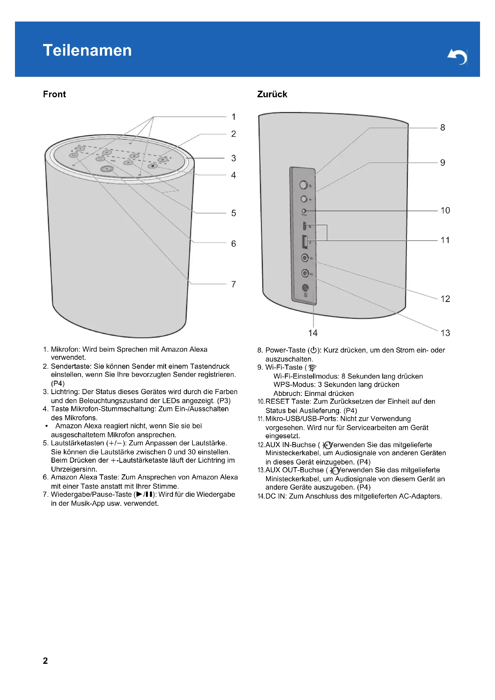 AUX IN-Buchse ( ): Verwenden Sie das mitgelieferte Ministeckerkabel, um Audiosignale von anderen Geräten in dieses Gerät einzugeben. (P4)