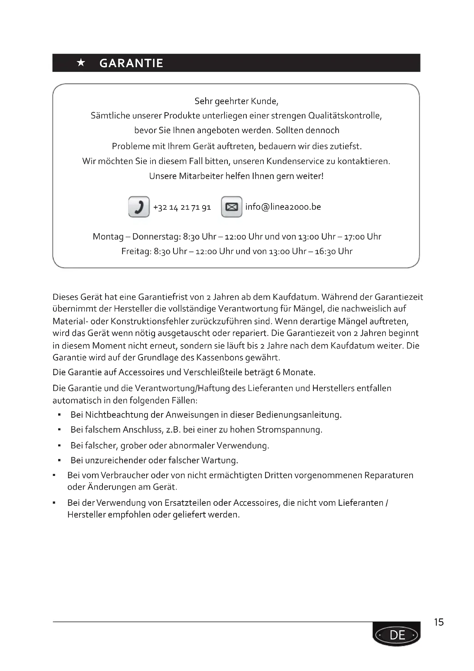 « GARANTIE Sehr geehrter Kunde, Sämtliche unserer Produkte unterliegen einer strengen Qualitätskontrolle, bevor Sie Ihnen angeboten werden. Sollten dennoch Probleme mit Ihrem Gerät auftreten, bedauern wir dies zutiefst. Wir möchten Sie in diesem Fall bitten, unseren Kundenservice zu kontaktieren. Unsere Mitarbeiter helfen Ihnen gern weiter! +32 14 21 71 91 info@linea2000.be Montag – Donnerstag: 8:30 Uhr – 12:00 Uhr und von 13:00 Uhr – 17:00 Uhr Freitag: 8:30 Uhr – 12:00 Uhr und von 13:00 Uhr – 16:30 Uhr Dieses Gerät hat eine Garantiefrist von 2 Jahren ab dem Kaufdatum. Während der Garantiezeit übernimmt der Hersteller die vollständige Verantwortung für Mängel, die nachweislich auf Material- oder Konstruktionsfehler zurückzuführen sind. Wenn derartige Mängel auftreten, wird das Gerät wenn nötig ausgetauscht oder repariert. Die Garantiezeit von 2 Jahren beginnt in diesem Moment nicht erneut, sondern sie läuft bis 2 Jahre nach dem Kaufdatum weiter. Die Garantie wird auf der Grundlage des Kassenbons gewährt. Die Garantie auf Accessoires und Verschleißteile beträgt 6 Monate. Die Garantie und die Verantwortung/Haftung des Lieferanten und Herstellers entfallen automatisch in den folgenden Fällen: