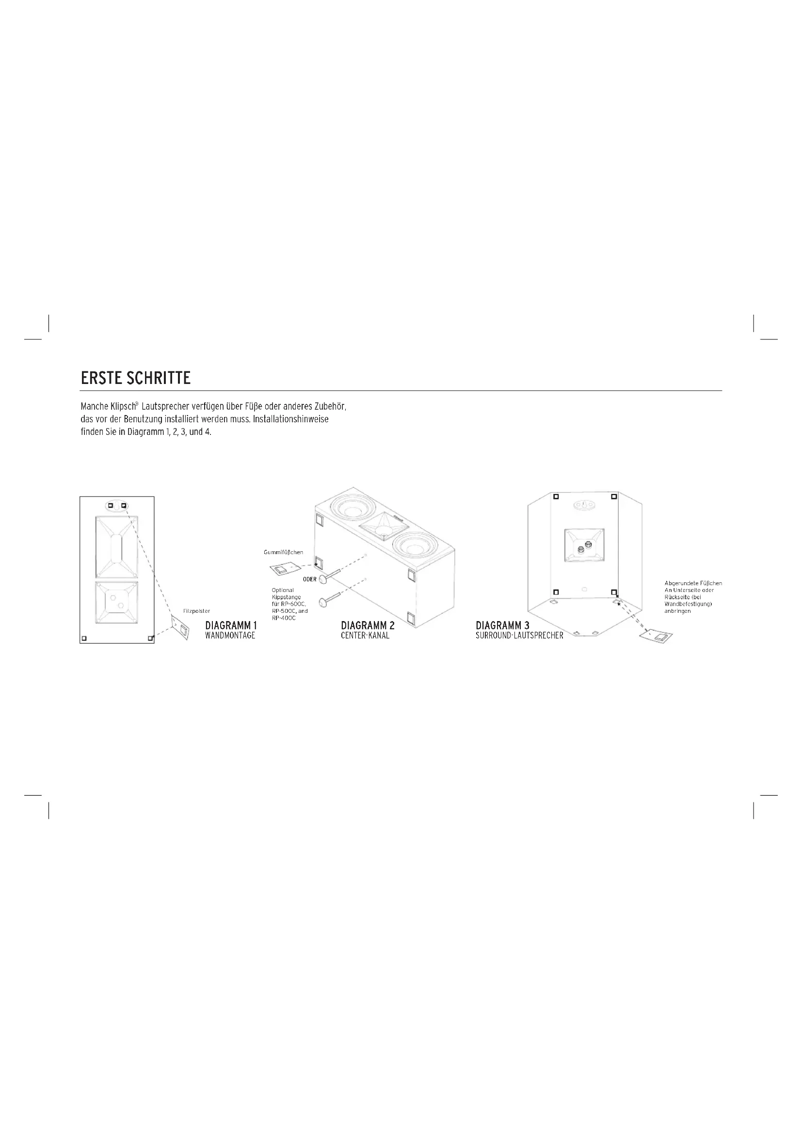 Manche Klipsch ^® Lautsprecher verfügen über Füße oder anderes Zubehör, das vor der Benutzung installiert werden muss. Installationshinweise finden Sie in Diagramm 1, 2, 3, und 4.