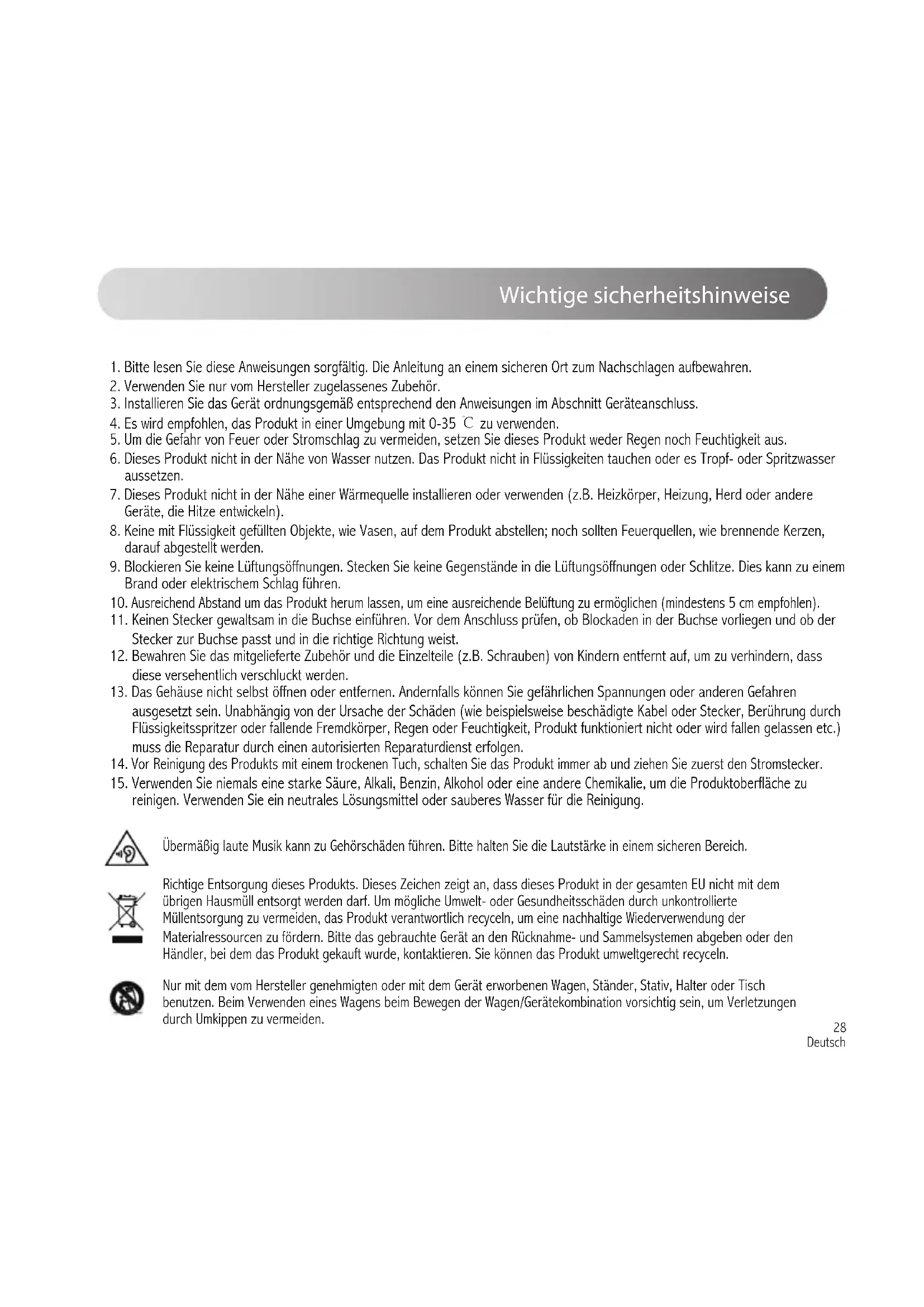 Vor Reinigung des Produkts mit einem trockenen Tuch, schalten Sie das Produkt immer ab und ziehen Sie zuerst den Stromstecker. 15. Verwenden Sie niemals eine starke Säure, Alkali, Benzin, Alkohol oder eine andere Chemikalie, um die Produktoberfläche zu reinigen. Verwenden Sie ein neutrales Lösungsmittel oder sauberes Wasser für die Reinigung.29 Deutsch Wichtige sicherheitshinweise Dieses Symbol macht den Benutzer auf die Präsenz gefährlicher Spannung im Gehäuse des Produkts aufmerksam, die stark genug sein kann, um ein Stromschlag-Risiko für Personen darzustellen. Dieses Symbol warnt den Benutzer, das Gehäuse des Produkts nicht zu zerlegen und weist darauf hin, dass es im Inneren keine durch den Benutzer austauschbare Teile gibt. Bringen Sie das Produkt zur Reparatur zu einem autorisierten Kundendienst-Zentrum. Dieses Symbol weist darauf hin, dass das Produkt nur für den Innenbereich geeignet ist. Dieses Symbol weist darauf hin, dass es sich um ein Produkt der KLASSE II handelt bzw. um ein doppelt isoliertes elektrisches Gerät, das keine Erdung erfordert. Stromwarnung: