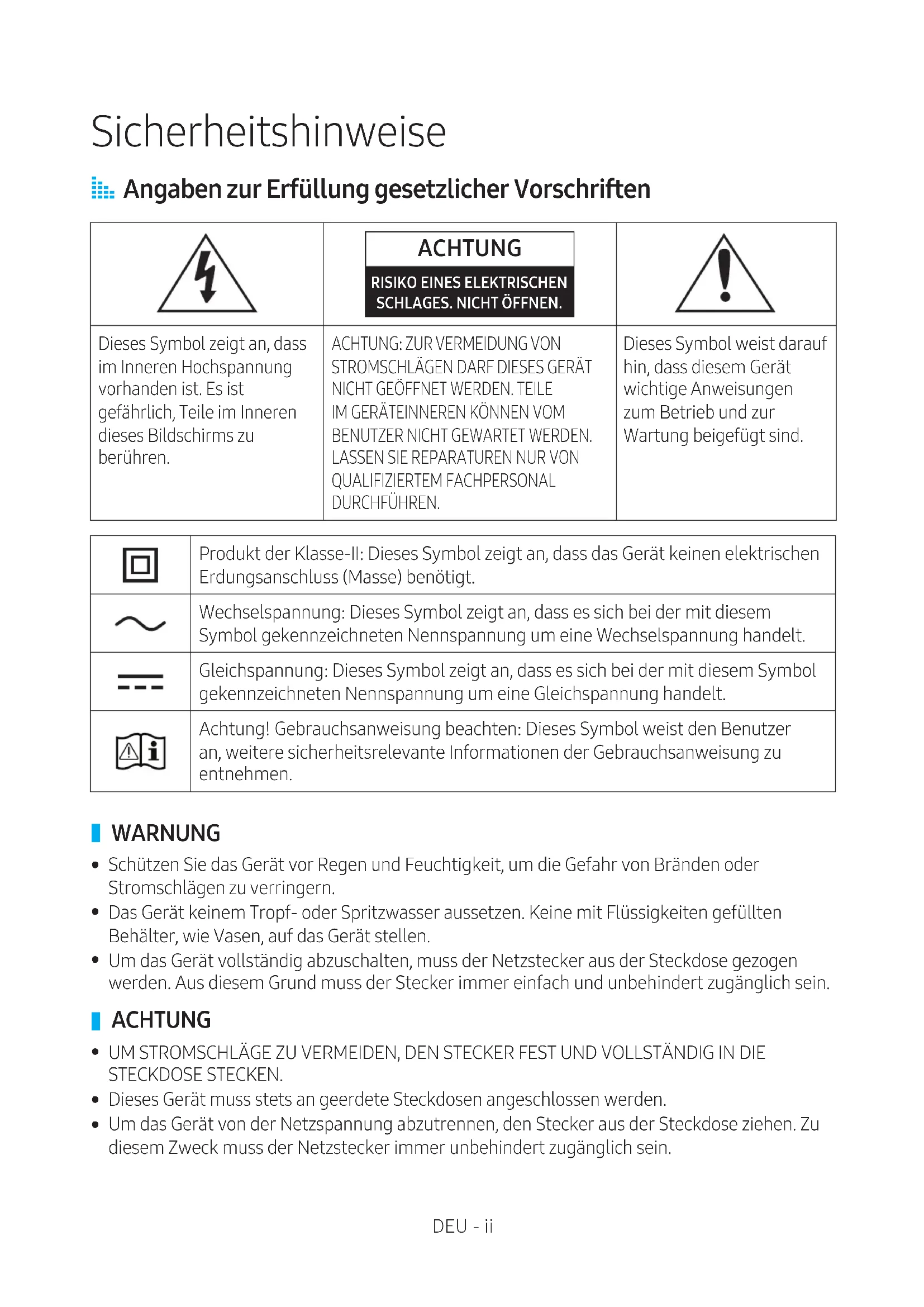 QUALIFIZIERTEM FACHPERSONAL DURCHFÜHREN. Dieses Symbol weist darauf hin, dass diesem Gerät wichtige Anweisungen zum Betrieb und zur Wartung beigefügt sind. Produkt der Klasse-II: Dieses Symbol zeigt an, dass das Gerät keinen elektrischen Erdungsanschluss (Masse) benötigt. Wechselspannung: Dieses Symbol zeigt an, dass es sich bei der mit diesem Symbol gekennzeichneten Nennspannung um eine Wechselspannung handelt. Gleichspannung: Dieses Symbol zeigt an, dass es sich bei der mit diesem Symbol gekennzeichneten Nennspannung um eine Gleichspannung handelt. Achtung! Gebrauchsanweisung beachten: Dieses Symbol weist den Benutzer an, weitere sicherheitsrelevante Informationen der Gebrauchsanweisung zu entnehmen.
