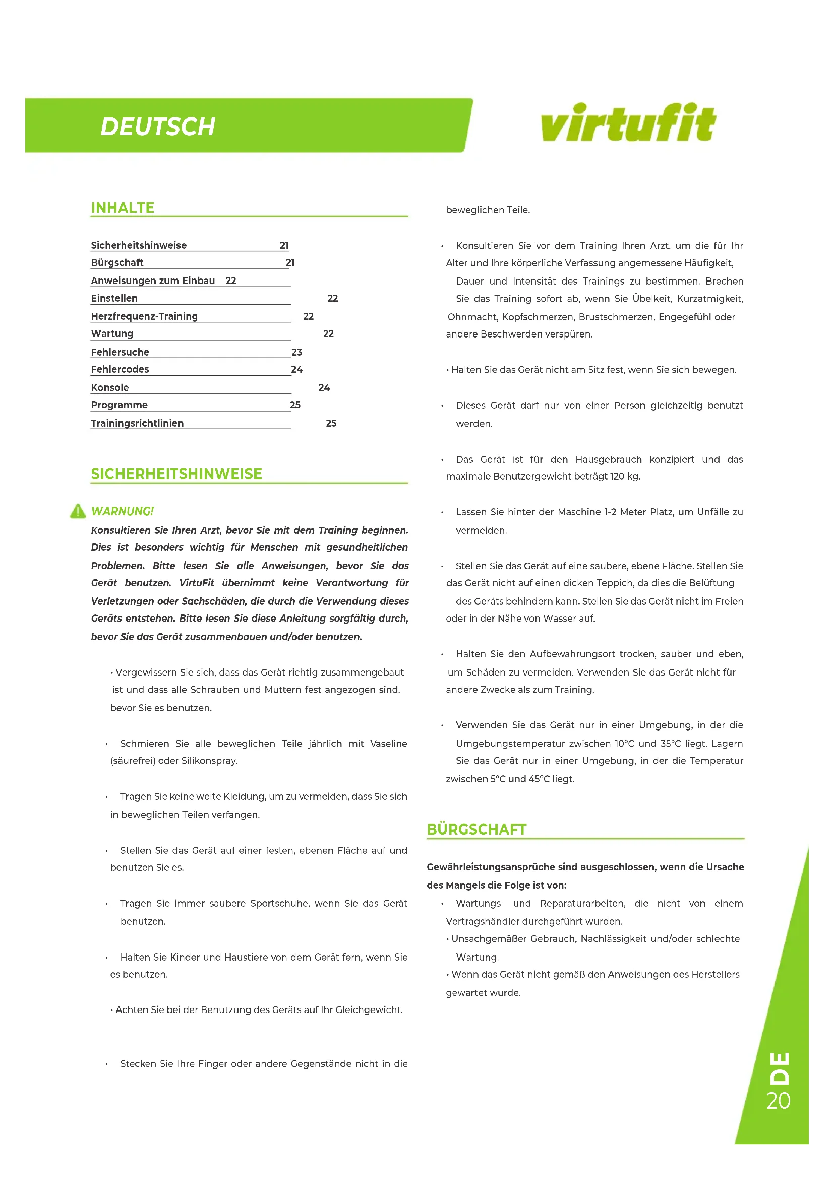 Konsultieren Sie ihren Arzt, bevor Sie mit dem Training beginnen. Dies ist besonderss wichtig für Menschen mit gesundheitlichen Problemen.itte lessen Si alle Anweisungen,bevor Sie das Gerat benutzen.VirtuFit ubernimmtKeine Verantwortung fur Verletzungen oder Sachschaden, die durch die Verwendung dieseres Gerats entstehen.itte lessen Si diese Anleitung sorgfaltig durch, bevor Sie das Gerat zusammenbauen und/oder benutzen.