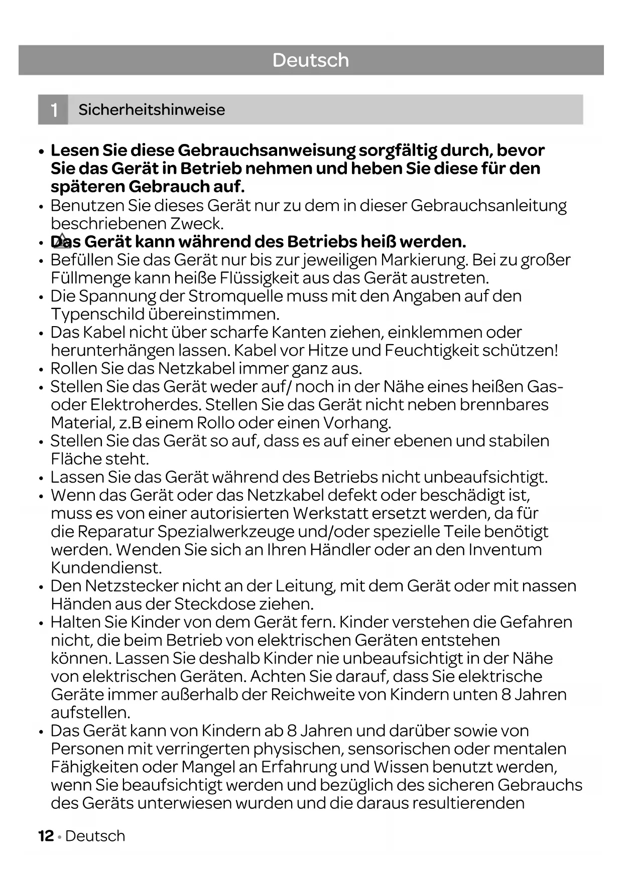 - Dieses Gerät ist nur für den häuslichen Gebrauch bestimmt. Wird es nicht ordnungsgemäß, (halb)professionel oder entgegen den Anweisungen dieser Anleitung verwendet, erlischt die Garantie und Inventum übernimmt keine Haftung für eingetretene Schäden.