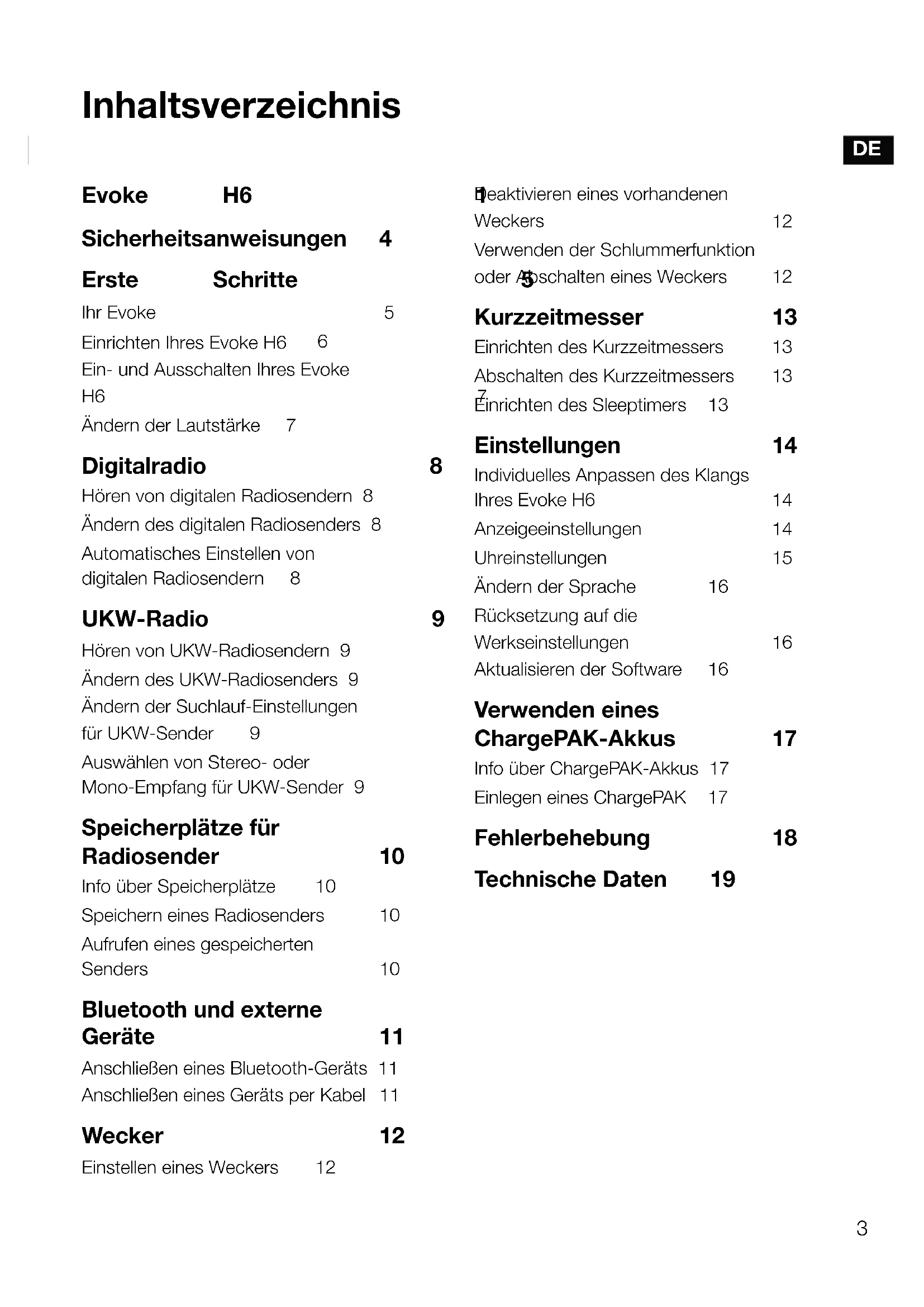 Verwenden der Schlummerfunktion oder Abschalten eines Weckers 12 Kurzzeitmesser 13 Einrichten des Kurzzeitmessers 13 Abschalten des Kurzzeitmessers 13 Einrichten des Sleeptimers 13 Einstellungen 14 Individuelles Anpassen des Klangs Ihres EvokeH6 14 Anzeigeeinstellungen 14 Uhreinstellungen 15 Ändern der Sprache 16 Rücksetzung auf die Werkseinstellungen 16 Aktualisieren der Software 16 Verwenden eines ChargePAK-Akkus 17 Info über ChargePAK-Akkus 17 Einlegen eines ChargePAK 17 Fehlerbehebung 18 Technische Daten 194 Sicherheitsanweisungen