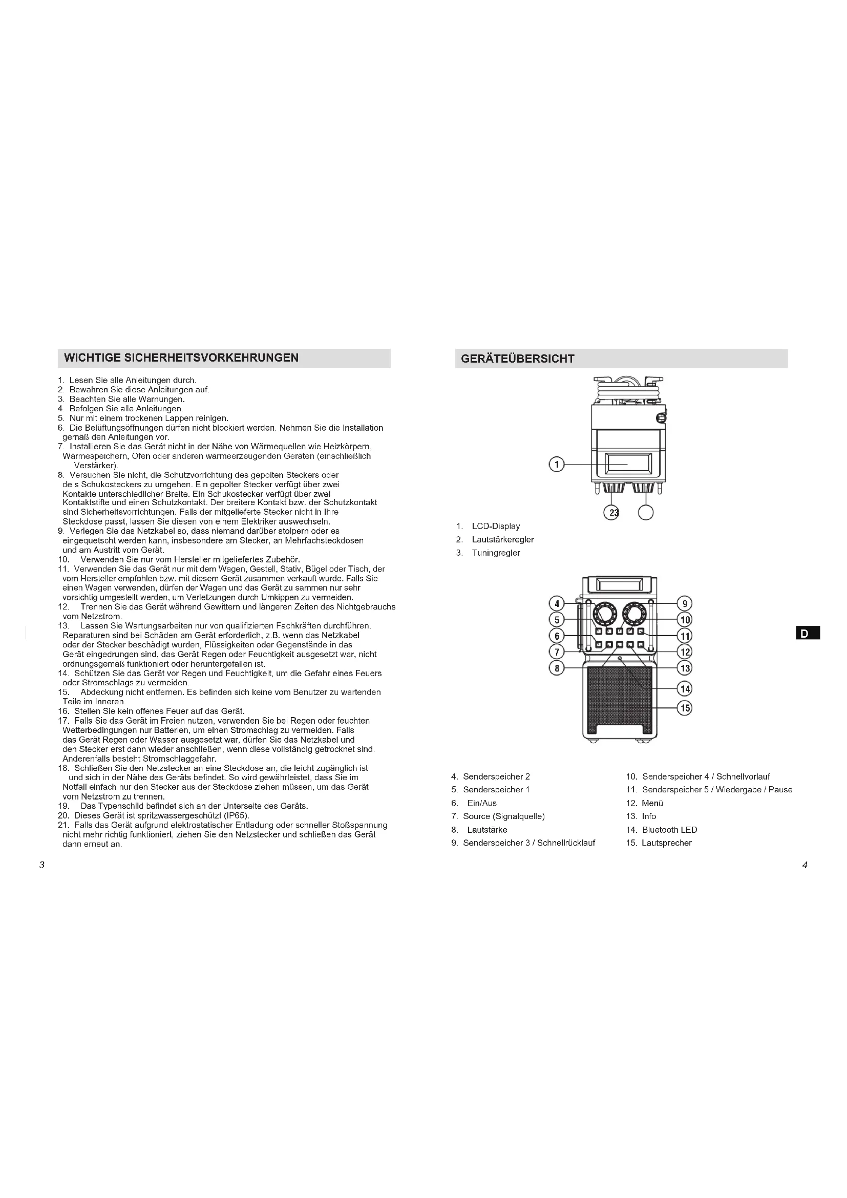 1. LCD-Display2. Lautstärkeregler3. Tuningregler4. Senderspeicher 25. Senderspeicher 1 6. Ein/Aus7. Source (Signalquelle)8. Lautstärke9. Senderspeicher 3 / Schnellrücklauf10. Senderspeicher 4 / Schnellvorlauf11. Senderspeicher 5 / Wiedergabe / Pause12. Menü13. Info14. Bluetooth LED15. Lautsprecher