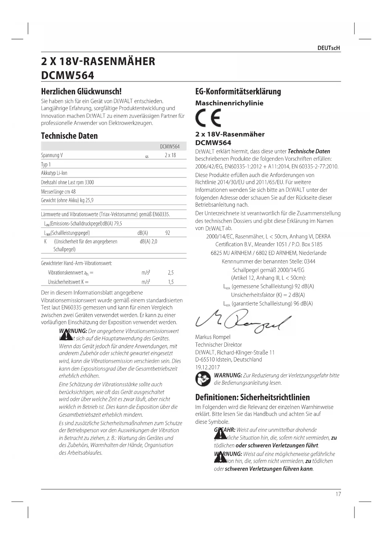 Der Unterzeichnete ist verantwortlich für die Zusammenstellung des technischen Dossiers und gibt diese Erklärung im Namen von DEWALT ab.