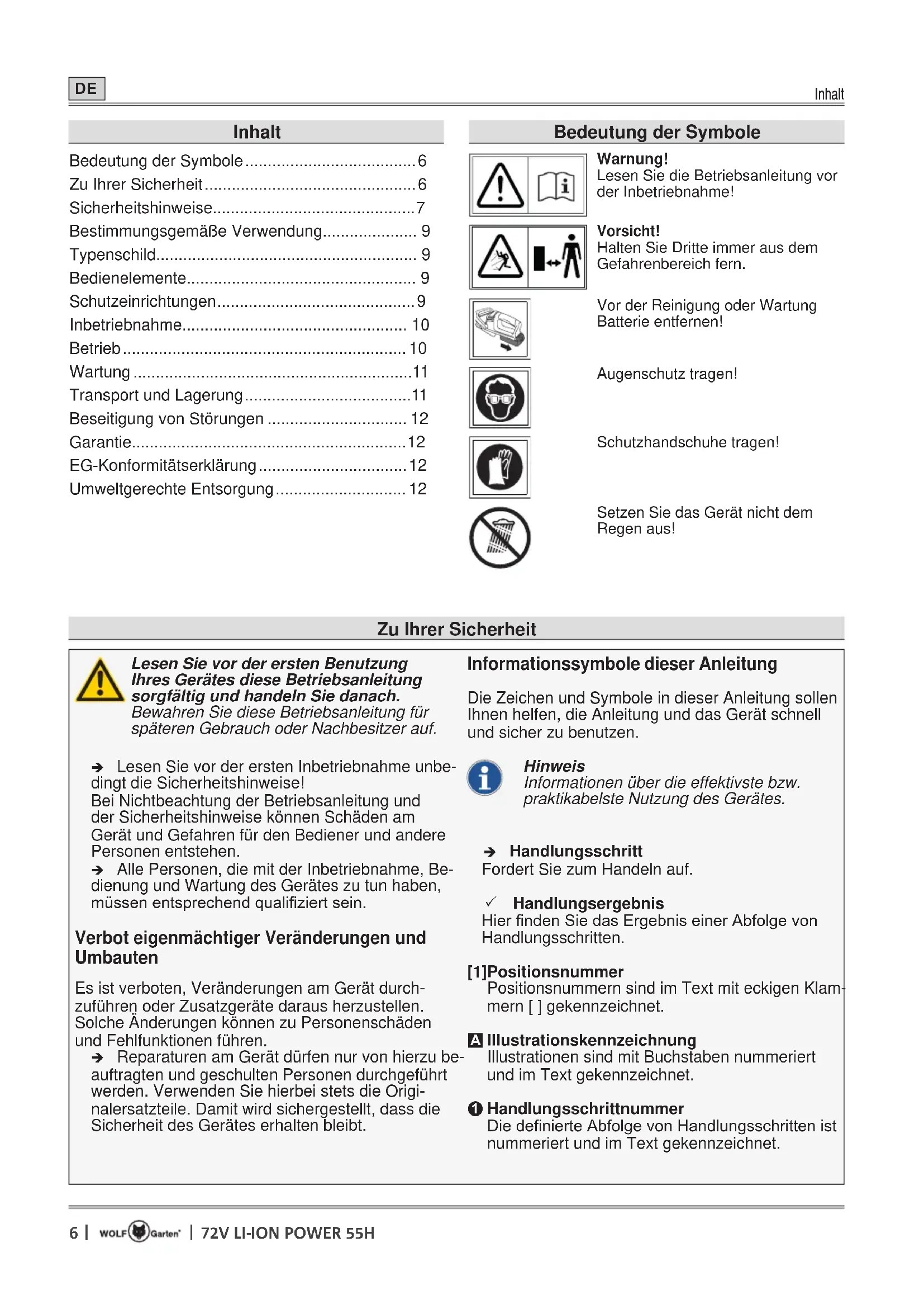 Finden Sie kostenlos die Bedienungsanleitung des Geräts 72V LiIon Accu Power 55H Wolf Garten als PDF.