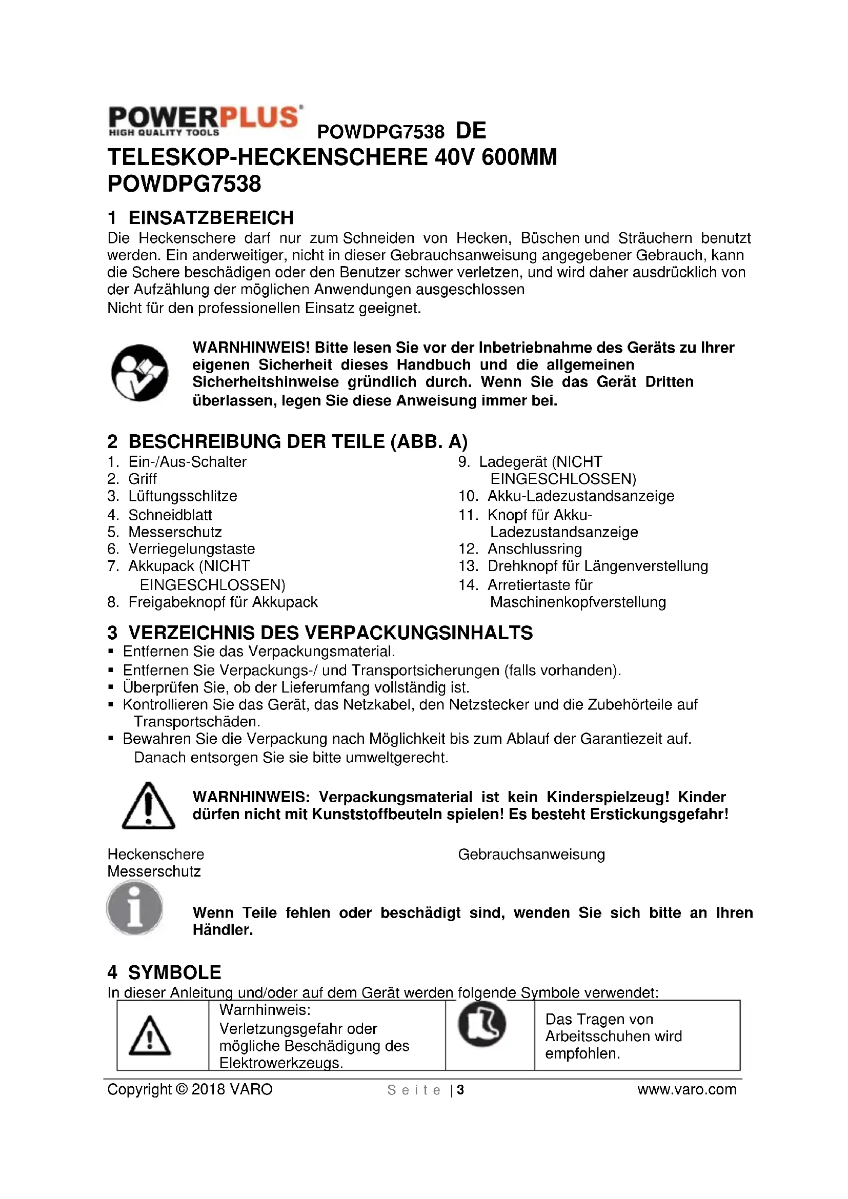 Das Tragen von Arbeitsschuhen wird empfohlen.POWDPG7538 DE Copyright © 2018 VARO S e i t e | 4 www.varo.com