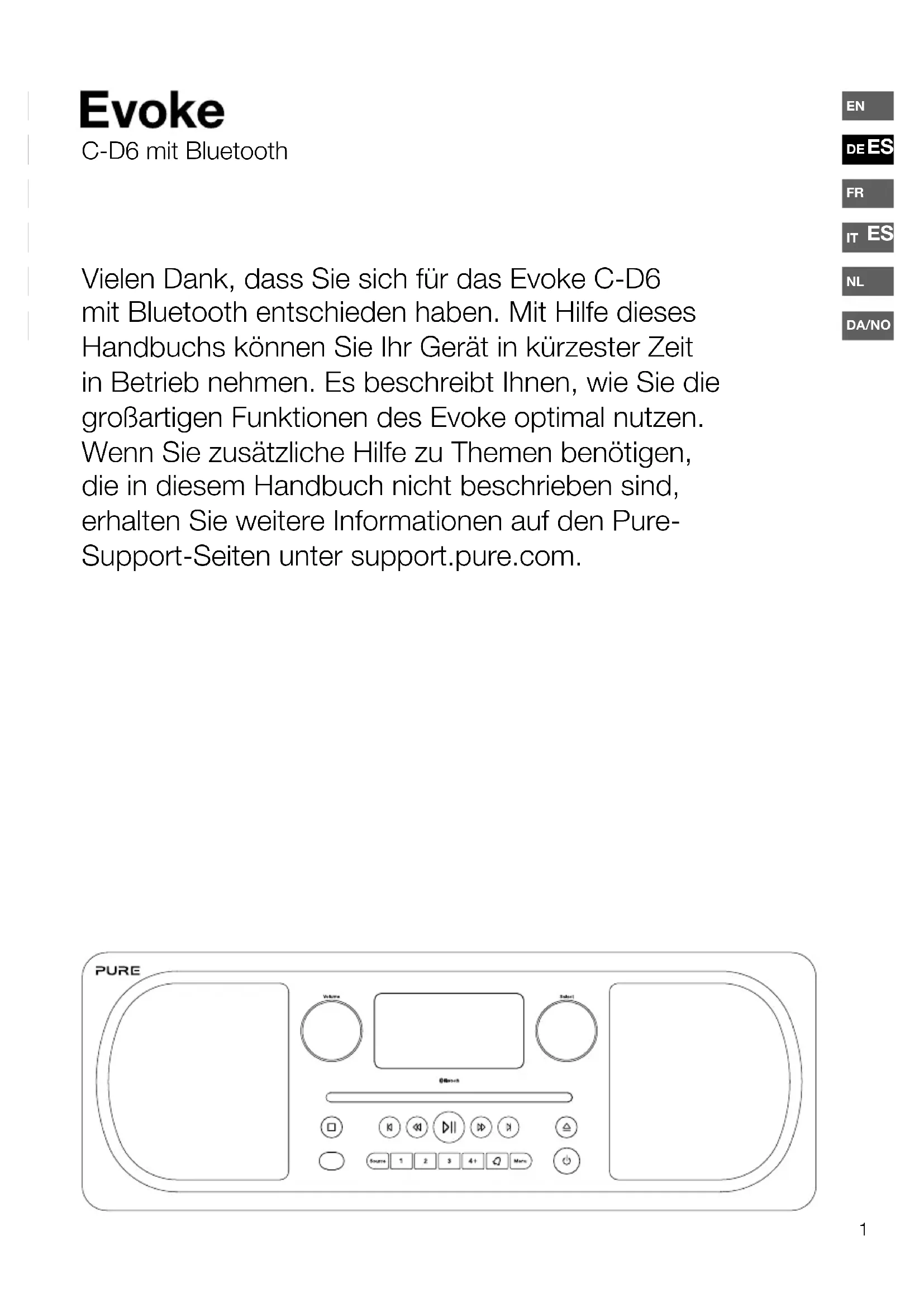 Vielen Dank, dass Sie sich für das Evoke C-D6 mit Bluetooth entschieden haben. Mit Hilfe dieses Handbuchs können Sie Ihr Gerät in kürzester Zeit in Betrieb nehmen. Esbeschreibt Ihnen, wie Sie die großartigen Funktionen des Evoke optimal nutzen. Wenn Sie zusätzliche Hilfe zu Themen benötigen, die in diesem Handbuch nicht beschrieben sind, erhalten Sie weitere Informationen auf den Pure- Support-Seiten unter support.pure.com. C-D6 mit Bluetooth2 Sicherheitsanweisungen