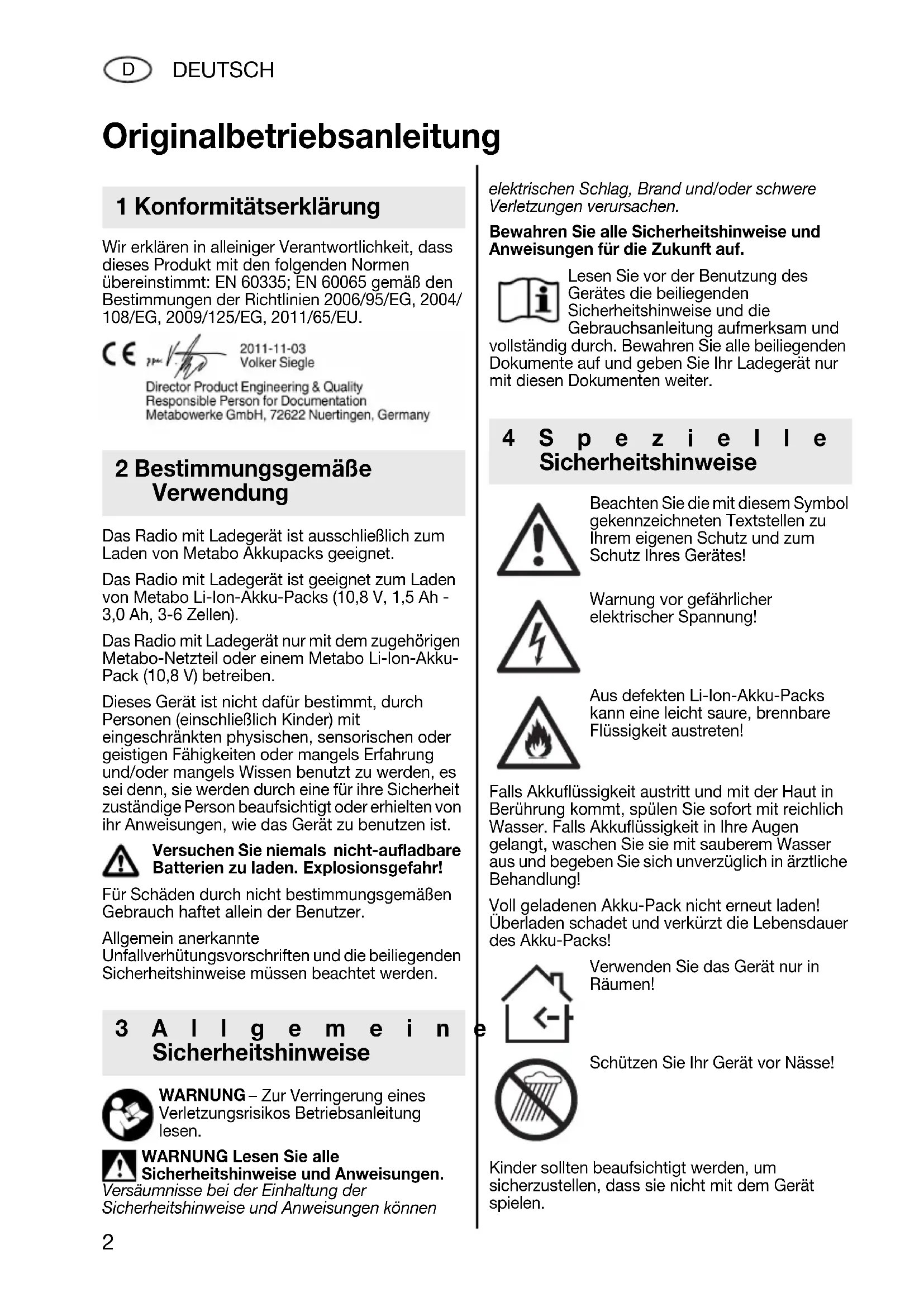 Wir erklären in alleiniger Verantwortlichkeit, dass dieses Produkt mit den folgenden Normen übereinstimmt: EN 60335; EN 60065 gemäß den Bestimmungen der Richtlinien 2006/95/EG, 2004/ 108/EG, 2009/125/EG, 2011/65/EU. Das Radio mit Ladegerät ist ausschließlich zum Laden von Metabo Akkupacks geeignet. Das Radio mit Ladegerät ist geeignet zum Laden von Metabo Li-Ion-Akku-Packs (10,8 V, 1,5 Ah - 3,0 Ah, 3-6 Zellen). Das Radio mit Ladegerät nur mit dem zugehörigen Metabo-Netzteil oder einem Metabo Li-Ion-Akku- Pack (10,8 V) betreiben. Dieses Gerät ist nicht dafür bestimmt, durch Personen (einschließlich Kinder) mit eingeschränkten physischen, sensorischen oder geistigen Fähigkeiten oder mangels Erfahrung und/oder mangels Wissen benutzt zu werden, es sei denn, sie werden durch eine für ihre Sicherheit zuständige Person beaufsichtigt oder erhielten von ihr Anweisungen, wie das Gerät zu benutzen ist. Versuchen Sie niemals nicht-aufladbare Batterien zu laden. Explosionsgefahr! Für Schäden durch nicht bestimmungsgemäßen Gebrauch haftet allein der Benutzer. Allgemein anerkannte Unfallverhütungsvorschriften und die beiliegenden Sicherheitshinweise müssen beachtet werden. WARNUNG – Zur Verringerung eines Verletzungsrisikos Betriebsanleitung lesen. WARNUNG Lesen Sie alle Sicherheitshinweise und Anweisungen. Versäumnisse bei der Einhaltung der Sicherheitshinweise und Anweisungen können elektrischen Schlag, Brand und/oder schwere Verletzungen verursachen. Bewahren Sie alle Sicherheitshinweise und Anweisungen für die Zukunft auf. Lesen Sie vor der Benutzung des Gerätes die beiliegenden Sicherheitshinweise und die Gebrauchsanleitung aufmerksam und vollständig durch. Bewahren Sie alle beiliegenden Dokumente auf und geben Sie Ihr Ladegerät nur mit diesen Dokumenten weiter. Beachten Sie die mit diesem Symbol gekennzeichneten Textstellen zu Ihrem eigenen Schutz und zum Schutz Ihres Gerätes! Warnung vor gefährlicher elektrischer Spannung! Aus defekten Li-Ion-Akku-Packs kann eine leicht saure, brennbare Flüssigkeit austreten! Falls Akkuflüssigkeit austritt und mit der Haut in Berührung kommt, spülen Sie sofort mit reichlich Wasser. Falls Akkuflüssigkeit in Ihre Augen gelangt, waschen Sie sie mit sauberem Wasser aus und begeben Sie sich unverzüglich in ärztliche Behandlung! Voll geladenen Akku-Pack nicht erneut laden! Überladen schadet und verkürzt die Lebensdauer des Akku-Packs! Verwenden Sie das Gerät nur in Räumen! Schützen Sie Ihr Gerät vor Nässe! Kinder sollten beaufsichtigt werden, um sicherzustellen, dass sie nicht mit dem Gerät spielen. Originalbetriebsanleitung 1 Konformitätserklärung 2 Bestimmungsgemäße Verwendung 3Allgemeine Sicherheitshinweise 4Spezielle SicherheitshinweiseDEUTSCH