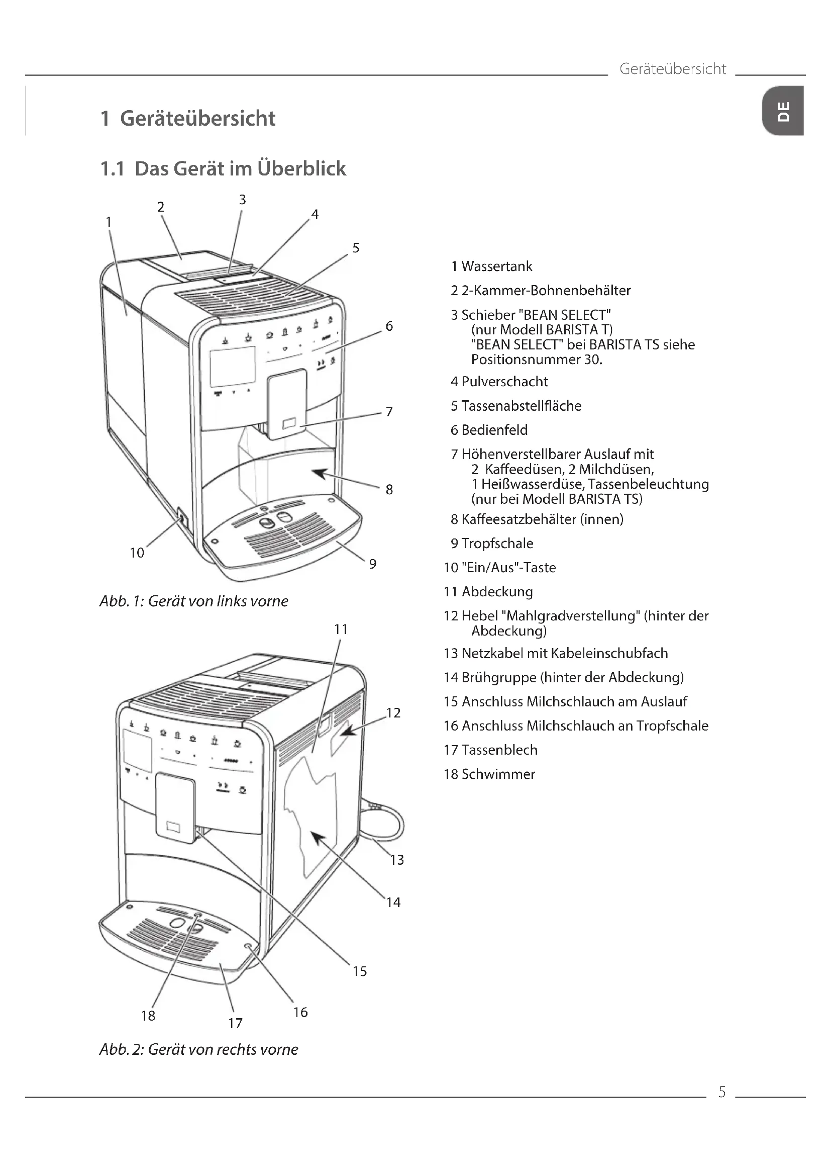 Abb. 2: Gerät von rechts vorne 1 Wassertank 2 2-Kammer-Bohnenbehälter 3 Schieber "BEAN SELECT" (nur Modell BARISTAT) "BEAN SELECT" bei BARISTA TS siehe Positionsnummer 30. 4 Pulverschacht 5 Tassenabstelläche 6 Bedienfeld 7 Höhenverstellbarer Auslauf mit 2 Kaeedüsen, 2 Milchdüsen, 1 Heißwasserdüse, Tassenbeleuchtung (nur bei Modell BARISTATS) 8 Kaeesatzbehälter (innen) 9 Tropfschale 10 "Ein/Aus"-Taste 11 Abdeckung 12 Hebel "Mahlgradverstellung" (hinter der Abdeckung) 13 Netzkabel mit Kabeleinschubfach 14 Brühgruppe (hinter der Abdeckung) 15 Anschluss Milchschlauch am Auslauf 16 Anschluss Milchschlauch an Tropfschale 17 Tassenblech 18 SchwimmerGeräteübersicht