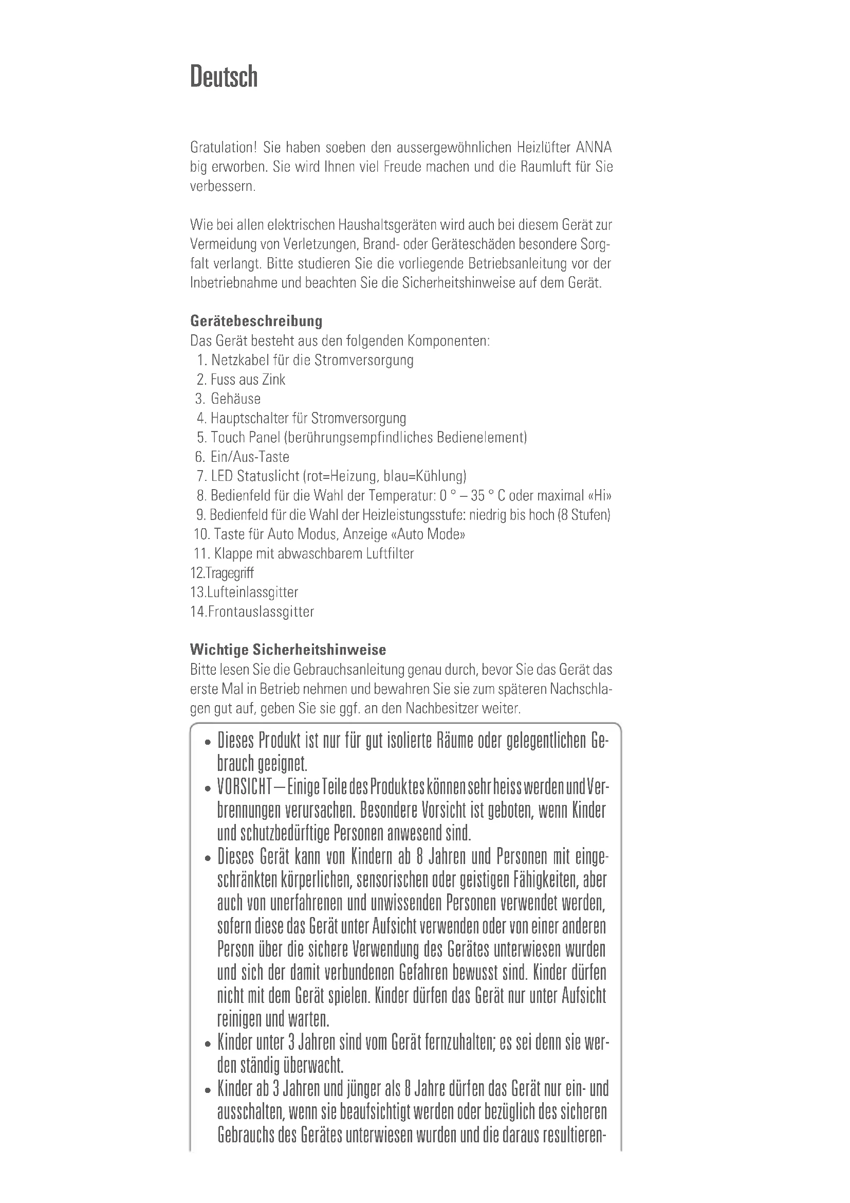 Gratulation! Sie haben soeben den aussergewöhnlichen Heizlüfter ANNA big erworbEN. Sie wird Ihnen viel Freude machen und die Raumluft für Sie verbessern.
