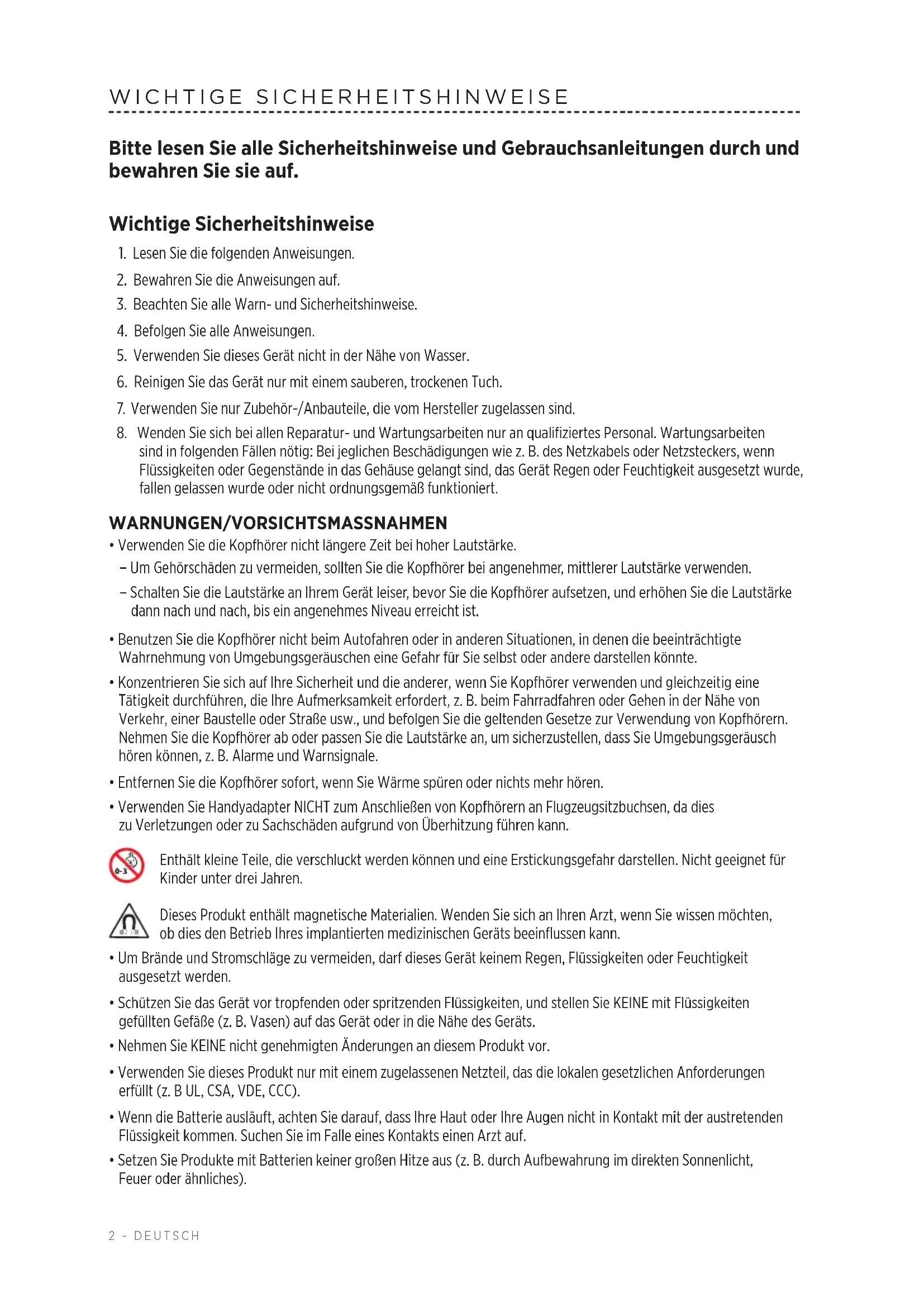 - Hvis din enhed er sluttet til hovedtelefonerne ved hjælp af kablet: – Fastgør begge ender af kablet. – Tilslut en anden enhed.DANSK - 252 - DEUTSCH WICHTIGE SICHERHEITSHINWEISE Bitte lesen Sie alle Sicherheitshinweise und Gebrauchsanleitungen durch und bewahren Sie sie auf. Wichtige Sicherheitshinweise