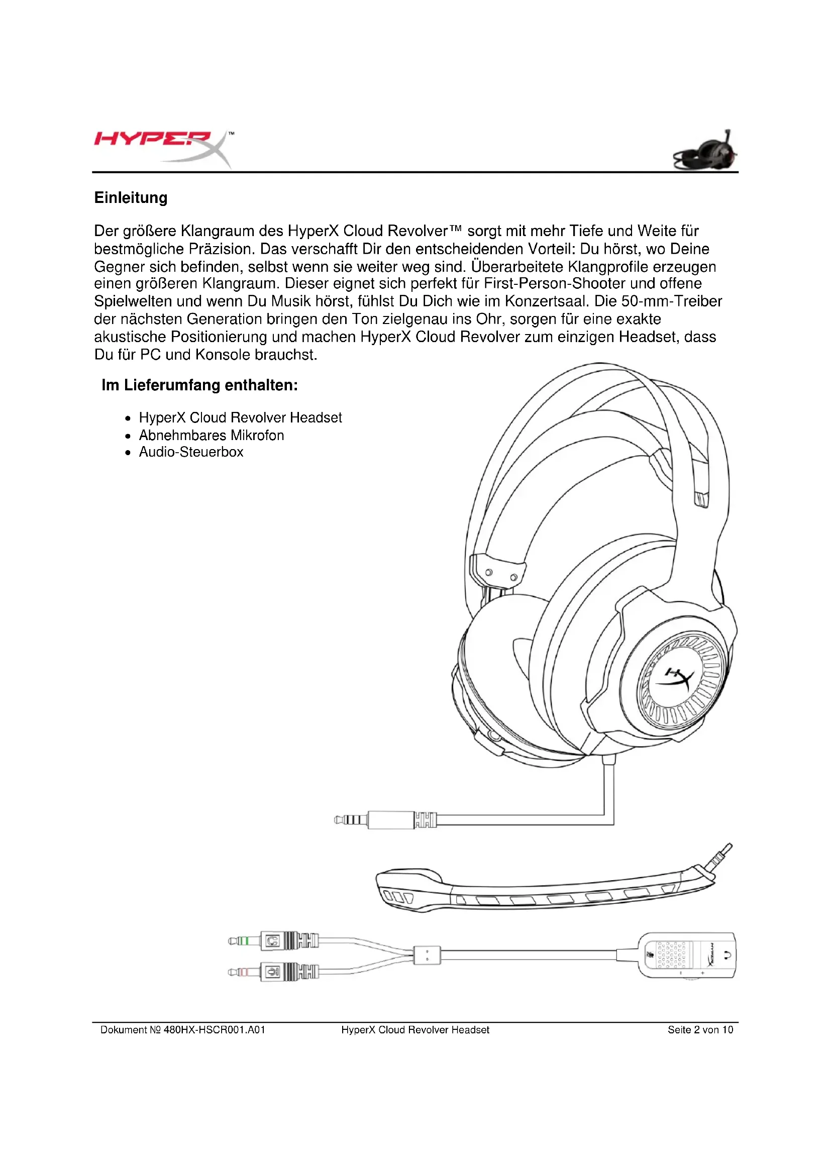 Einleitung Der größere Klangraum des HyperX Cloud Revolver™ sorgt mit mehr Tiefe und Weite für bestmögliche Präzision. Das verschafft Dir den entscheidenden Vorteil: Du hörst, wo Deine Gegner sich befinden, selbst wenn sie weiter weg sind. Überarbeitete Klangprofile erzeugen einen größeren Klangraum. Dieser eignet sich perfekt für First-Person-Shooter und offene Spielwelten und wenn Du Musik hörst, fühlst Du Dich wie im Konzertsaal. Die 50-mm-Treiber der nächsten Generation bringen den Ton zielgenau ins Ohr, sorgen für eine exakte akustische Positionierung und machen HyperX Cloud Revolver zum einzigen Headset, dass Du für PC und Konsole brauchst. Im Lieferumfang enthalten: HyperX Cloud Revolver Headset Abnehmbares Mikrofon Audio-SteuerboxDokument Nr. 480HX-HSCR001.A01 HyperX Cloud Revolver Headset Seite 3 von 10