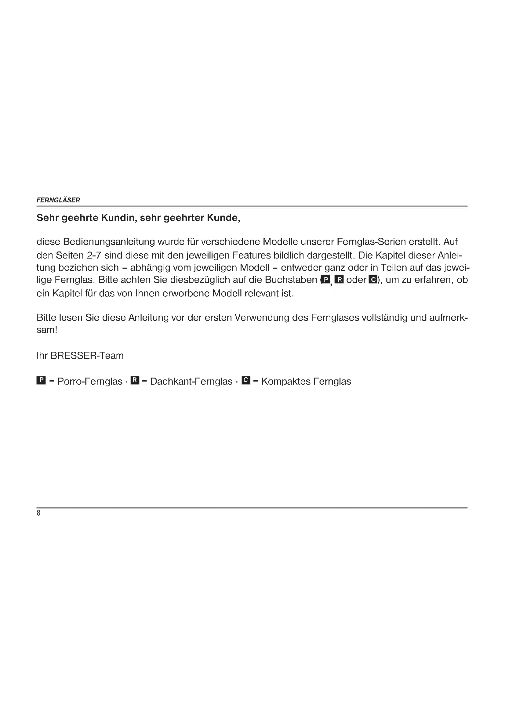 ), um zu erfahren, ob ein Kapitel für das von Ihnen erworbene Modell relevant ist. Bitte lesen Sie diese Anleitung vor der ersten Verwendung des Fernglases vollständig und aufmerk- sam! Ihr BRESSER-Team